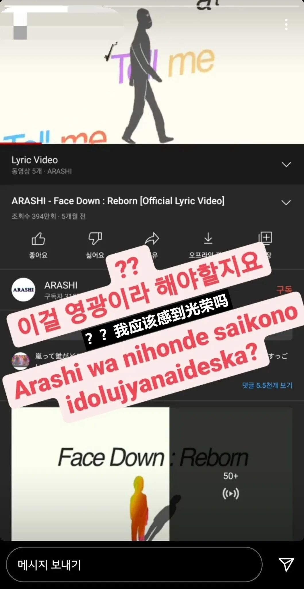首先他在日本男子组合岚(ARASHI)的《Face Down:Reborn》歌词版MV播放页面截图上写道“??我应该感到光荣吗”。
