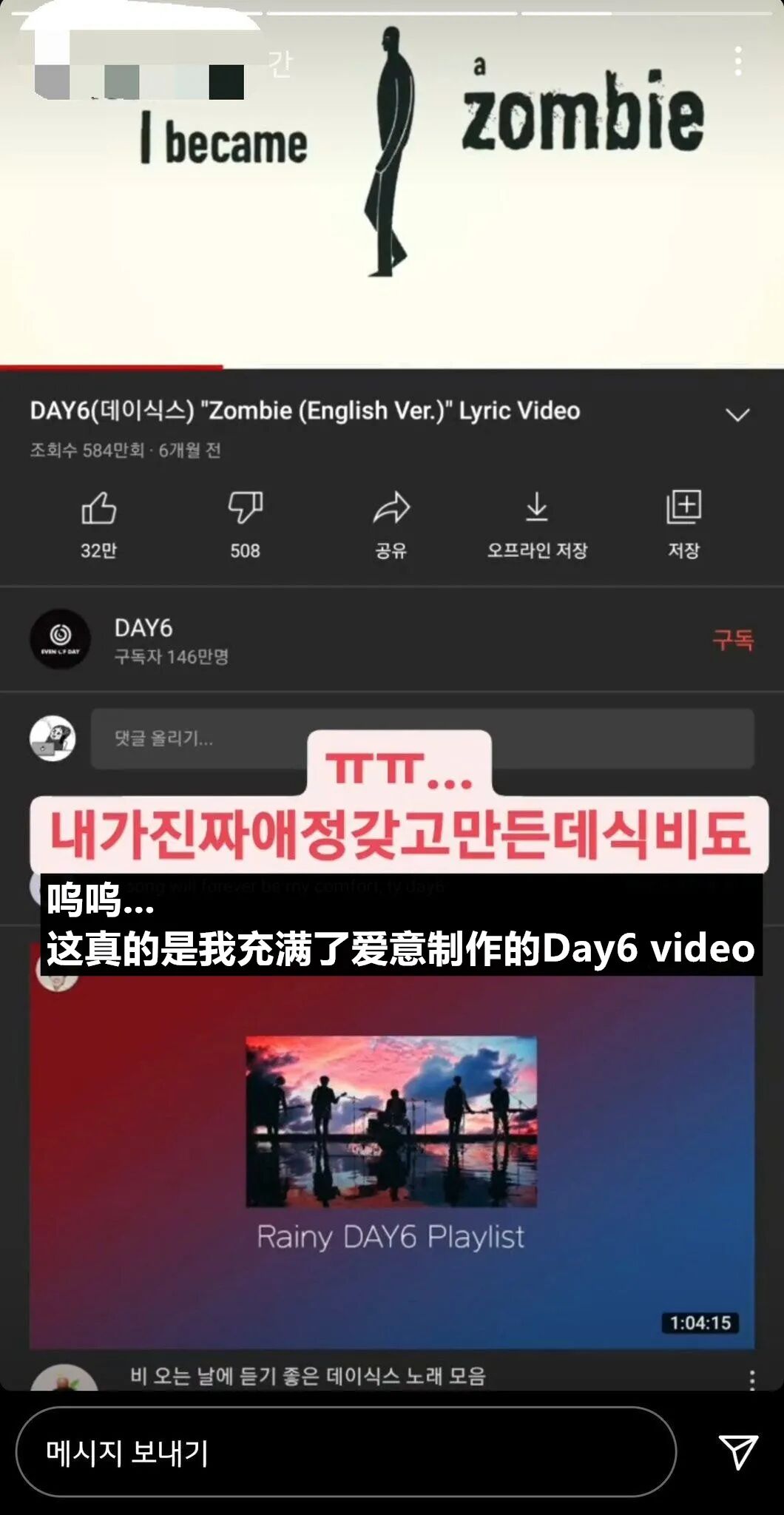 同时他还在Day6《Zombie》歌词版MV播放页面截图上写道“呜呜...这真的是我充满了爱意制作的Day6 video”。