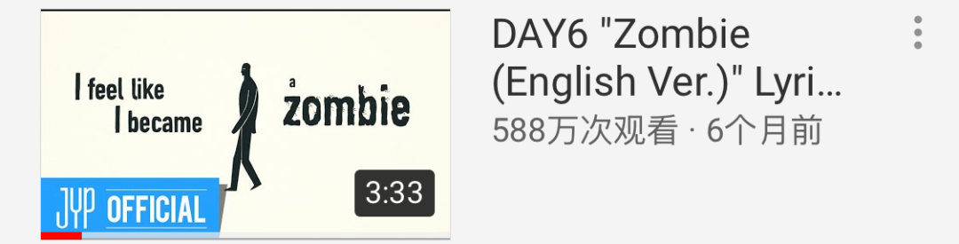 其中Day6《Zombie》的歌词版MV于今年5月发布,截至目前的累计点击量为588万次。