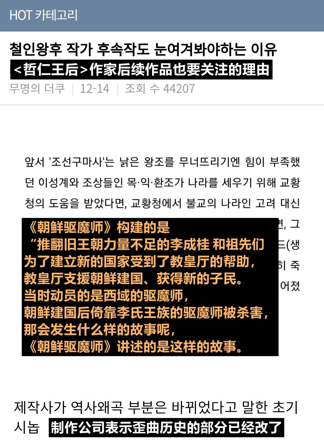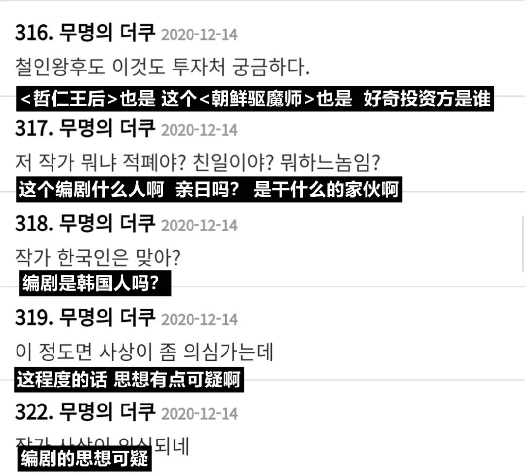 《哲仁王后》“歪曲历史”的相关争议爆发后,该电视剧的编剧朴继玉的下一部作品也受到了质疑。据悉朴继玉的下一部作品是《朝鲜驱魔师》,有网友在看过了该剧的剧本围读场面以及编剧的描述后发帖表示“《朝鲜驱魔师》是西域驱魔师进入朝鲜的内容,虽然内容有所变动,但能否顺利改编是个疑问”,网友们对此纷纷表示:“这个编剧是韩国人吗”等。
