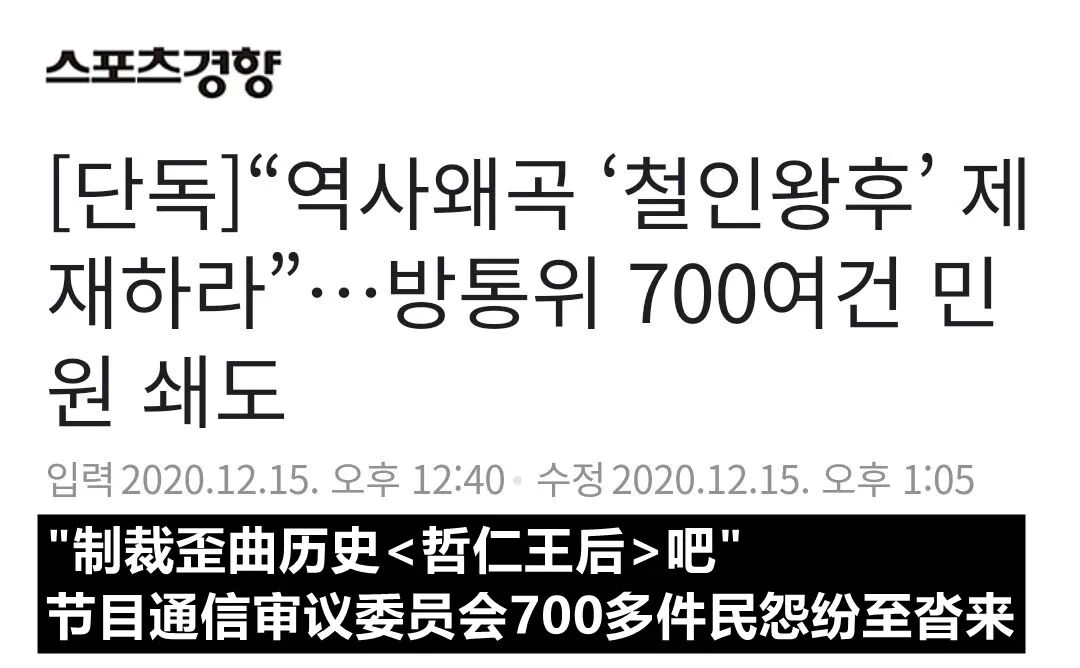 另外根据韩媒体育京乡的独家报道,韩国节目通信审议会近日收到了763件关于《哲仁王后》的观众抗议投诉,观众们不满的主要内容是《哲仁王后》中存在歪曲历史和文化遗产的行为,以及疑似性骚扰(丰壤赵氏夸张的行为被认为有性骚扰嫌疑)的行为。通信审议委员会方面表示具体处理结果需要讨论后再做决定。目前《哲仁王后》的相关争议还在不断发酵中。