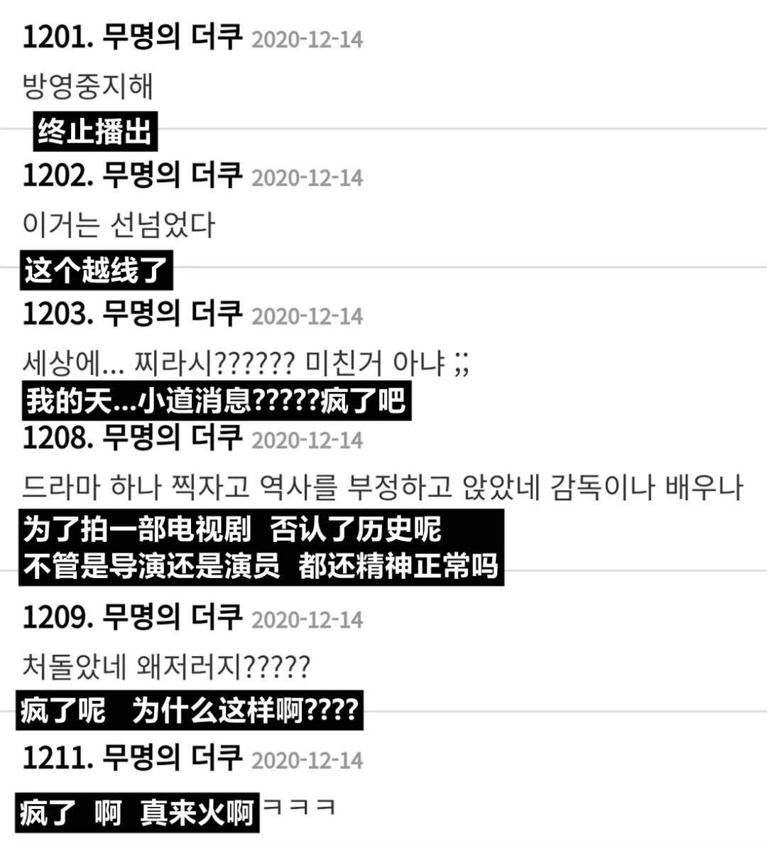 韩国网友也对此表示“偏偏要用实际存在的人物来进行搞笑,无法接受”“再怎么是喜剧也不能这么描述实际存在的人物啊”等。有人指出:虽然电视剧开头曾注明“登场的人物、团体、事件等与历史事实无关,是虚构创作的”,但《哲仁王后》团队制作历史剧时的历史意识令人怀疑。 三、《哲仁王后》编剧、演员相关争议1.编剧