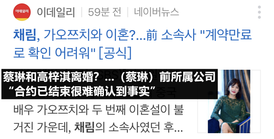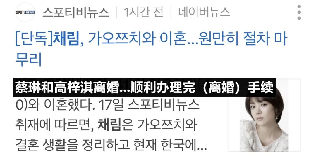 今日下午据韩媒Spotvnews独家报道表示,韩国女演员蔡琳(41岁)最近已和中国男演员高梓淇(40岁)离婚,具体的离婚原因并未公开,据悉两人已经顺利地办理完离婚手续。