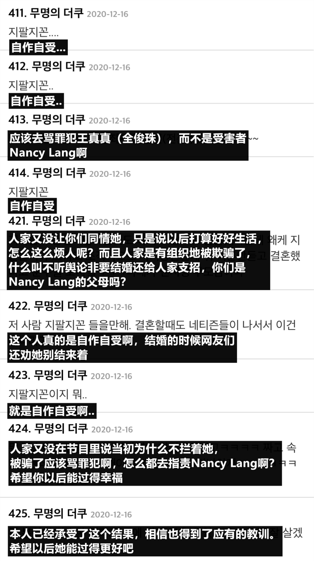 而对于她曾经的不幸经历,韩国网友们发表了褒贬不一的看法。其中一部分网友认为“Nancy Lang是自作自受”,另一部分网友表示“希望她今后能好好生活”...
