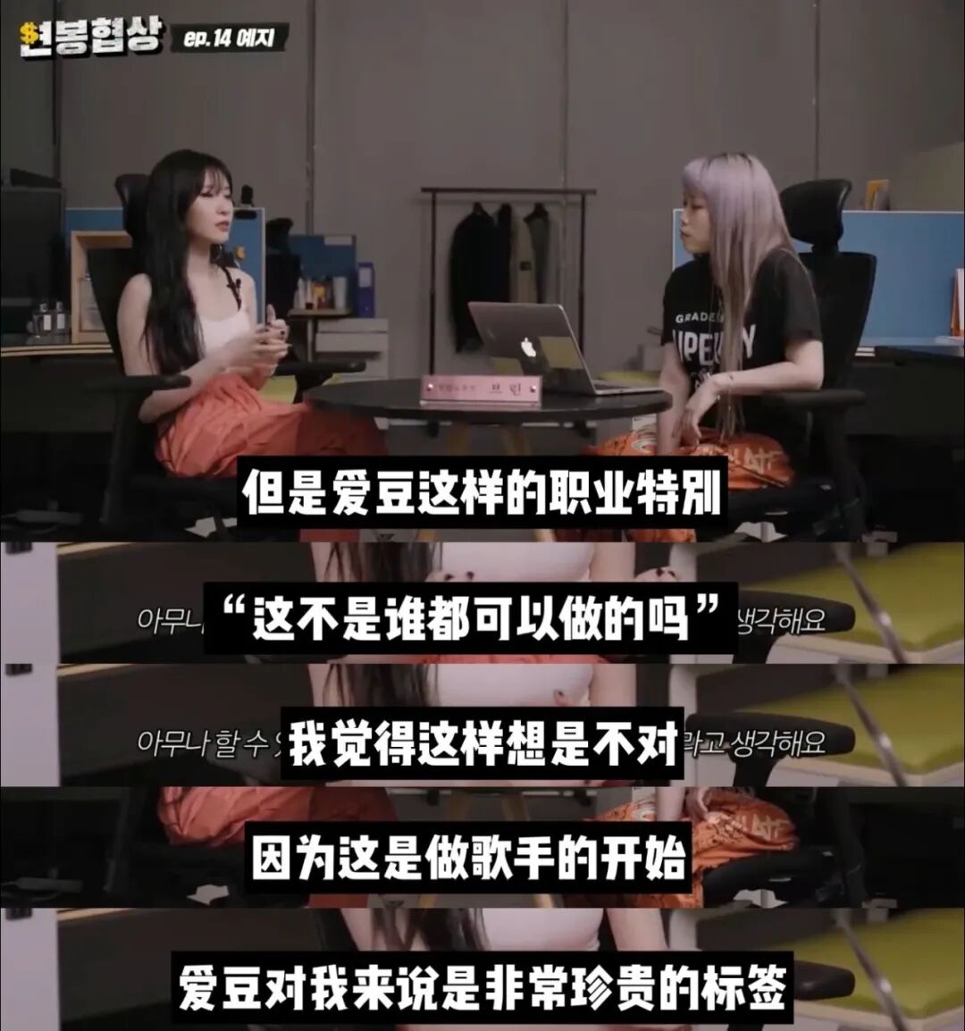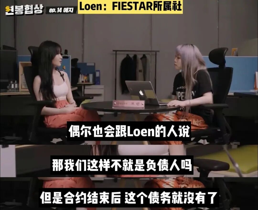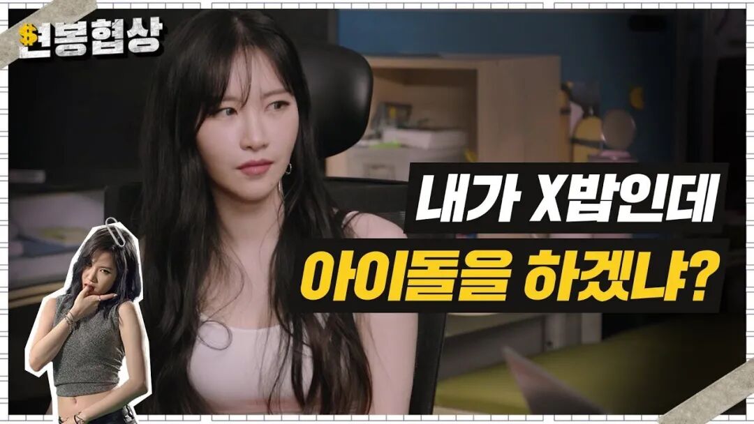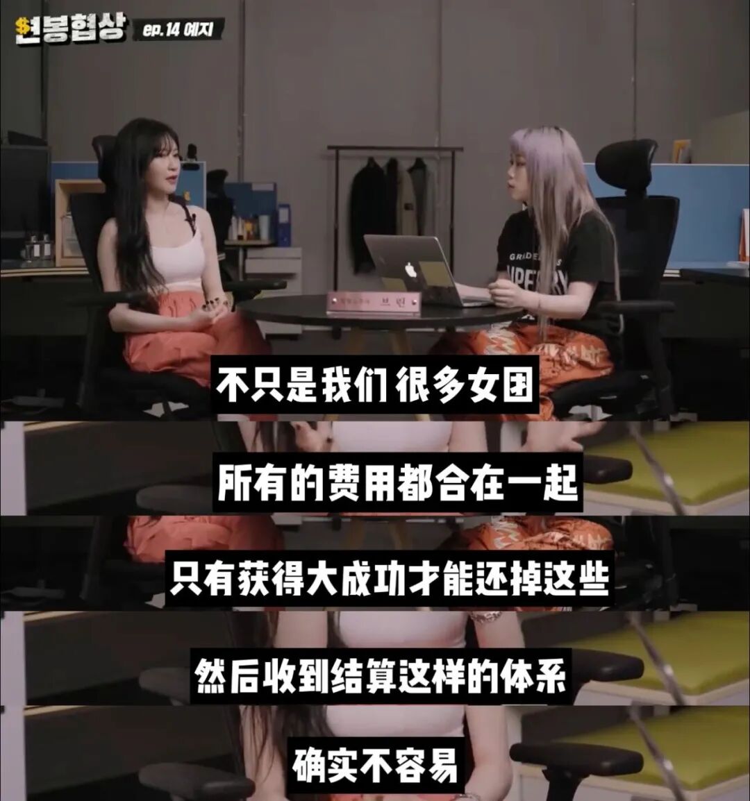 《年薪协商》是油管频道“GetTV”推出的一档采访艺人并最终让艺人写出自己理想年薪的节目。Yezi参与录制的节目于上月正式播出,节目中Yezi在谈及自己过去经历的过程中提到了组合虽然出道6年但一直没有收到结算的内容以及自己对爱豆标签的看法。主持人询问Yezi结算问题时,Yezi表示:我们确实一直没有收到结算。但其实女团都是一样的,娱乐公司的体系就是活动过程中产生的宿舍、MV拍摄、服装、美容等费用以后都以成员们的收入来偿还。只有获得极大的成功,大家才能还掉这部分费用,但其实要做到的话真的不容易。我不认为我们是因为没有努力才不火的,虽然努力了但就是没火,最后只能遗憾地解散。没有收到结算虽然很难过,但这也是现实。