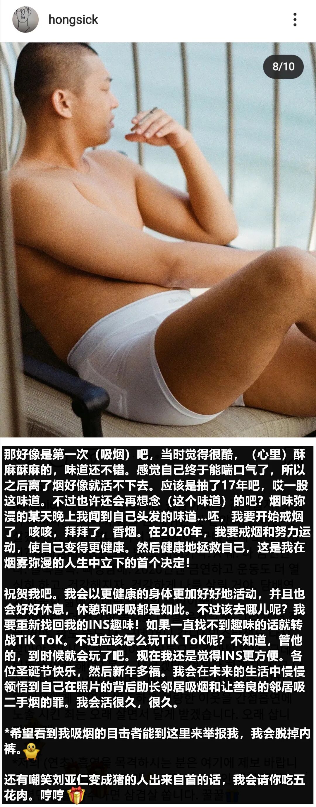 左右滑动可查看更多刘亚仁发布照片的同时,还发表了长文宣布自己将要开始戒烟,在长文中刘亚仁直接写出了“希望看到我吸烟的目击者能到这里来举报我,我会脱掉内裤”如此颇具冲击性的文字,详细如下: