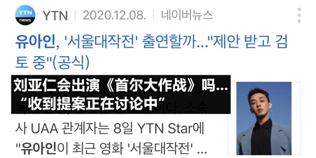 同时据媒体报道表示刘亚仁将出演以150亿韩元制作的犯罪娱乐动作电影《首尔大作战》,目前收到提案正在积极讨论中。该影片以1988年首尔奥林匹克为背景展开,主要讲述了上溪洞极盗车神们异想天开的偷盗秘密资金作战的故事。期待明年刘亚仁能够带来更多优秀的影视剧作品。
