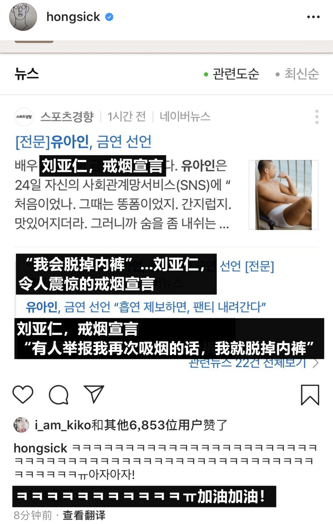 刘亚仁的戒烟宣言在INS公开后迅速被媒体进行了报道,相关新闻登上了热搜榜单。对此刘亚仁还在INS发表了媒体报道自己戒烟宣言的新闻截图,并配文“ㅋㅋㅋㅋㅋㅋㅋㅋㅋㅋㅋㅠ加油加油!”。