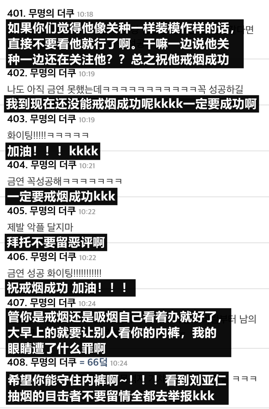 除了他本人公开的吸烟照外,韩国媒体还转载了多张在韩网搜索“刘亚仁吸烟”时就会出现的照片,照片中刘亚仁的烟瘾似乎达到了烟不离手的程度。在新闻下有不少韩国网友留言表示对他戒烟决心的支持,但同时也有网友认为刘亚仁是在借此博眼球。