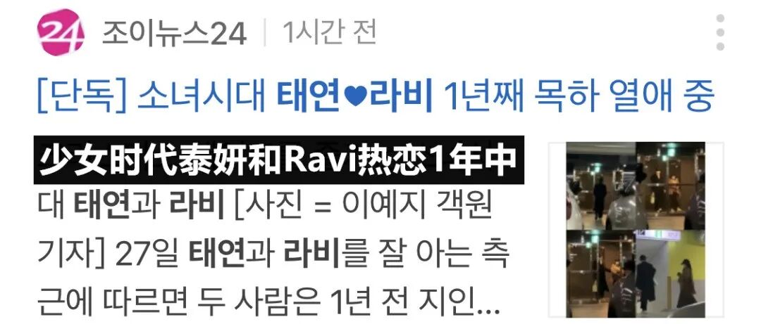 今日(27日)上午韩媒joynews24发表了题为《少女时代泰妍和Ravi热恋一年中》的独家报道。
