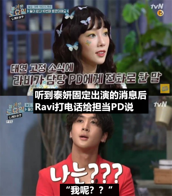 2.此前Ravi曾作为嘉宾出演了于11月28日播出的《惊人的星期六》,在当天的节目中泰妍曾表示:“听到我固定出演的消息后,Ravi还打电话给PD,说‘我呢?’”,体现出了她与Ravi的交情。