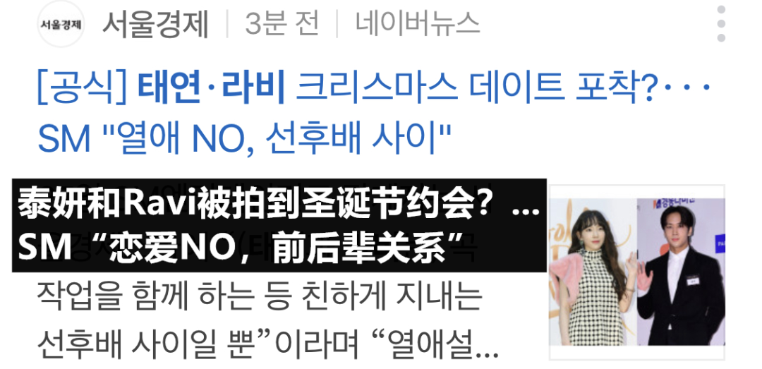 不过随后SM Ent.相关人士迅速对此作出了澄清,对媒体透露道:“(泰妍)与Ravi只是共同制作歌曲的关系亲密的前后辈关系而已,恋爱说不是事实”。