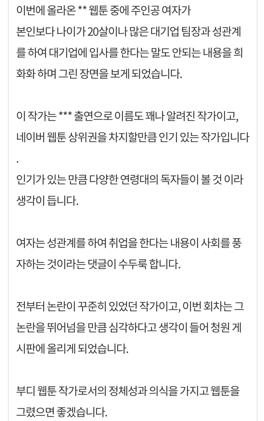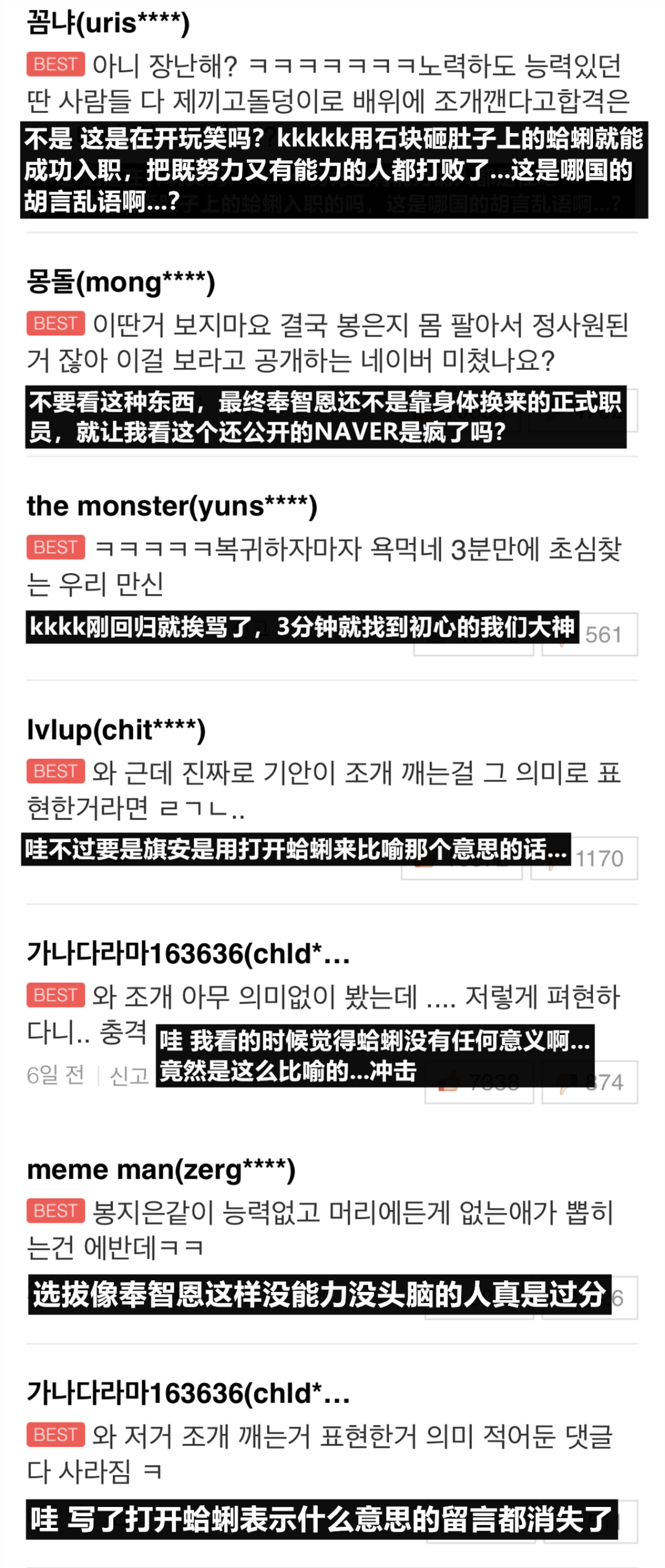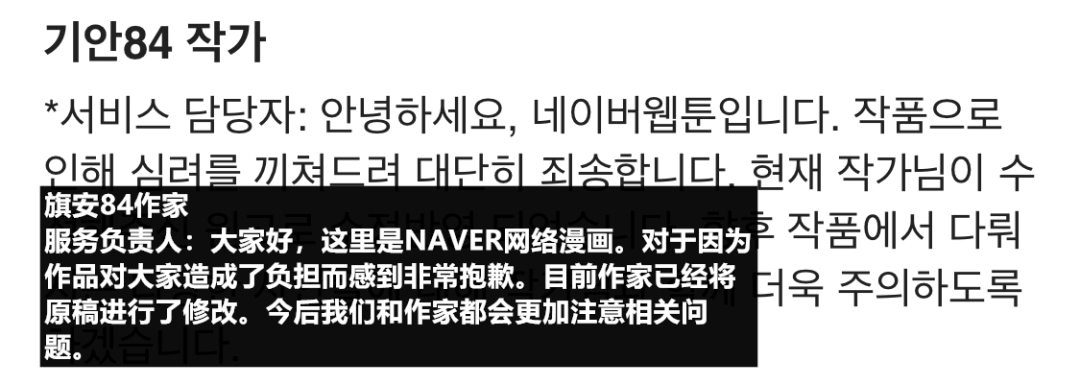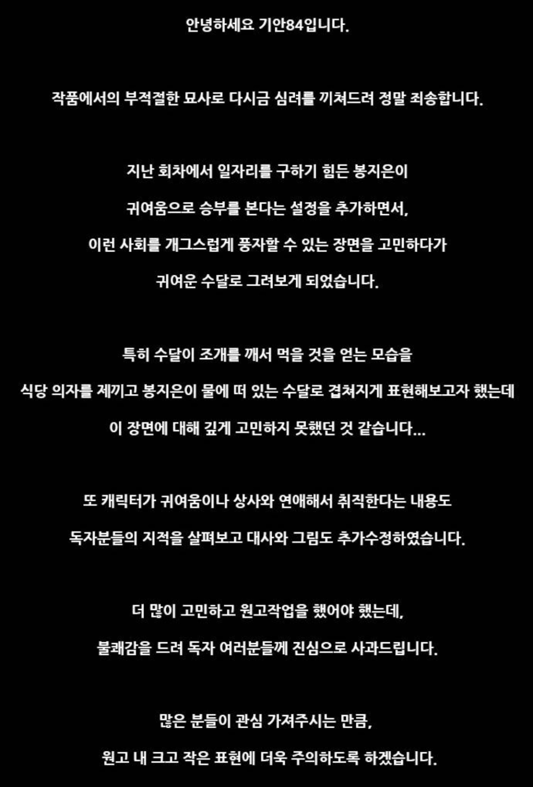 特别是把躺在餐厅椅子上的奉智恩比喻成躺在水里的水獭砸开蛤蜊吃的模样,对于这个场面的表述考虑欠佳...另外可爱的角色、和上司恋爱入职的内容,在考虑了读者们的指责后,重新改了台词和画。创作原稿的时候我应该更加谨慎,给各位读者造成了不快,对此真心感到抱歉。正如大家如此喜爱我的作品一样,今后我会更加注意原稿的各种表述。