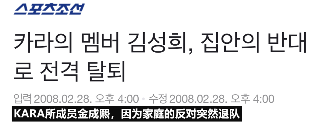 当时2008年金成熙退出组合时,KARA所属公司称:“加入KARA时就遭到家里反对的金成熙为了完成学业,在与父母进行协商后决定退出组合”。