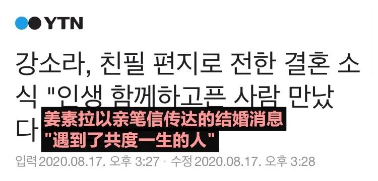 以下为姜素拉手写信全文:大家好,我是姜素拉。感觉时隔很久才和bling bling家人们问好。虽然很担心、很紧张该如何和大家问好,但我想先亲自把消息告诉大家,所以鼓起勇气写下了一字一句。不知不觉中,我已经出道11年了。因为比我更高兴、更开心(我出道这么久)的各位,我感受到了无法用语言去表达的感谢之情。承蒙大家11年来给予的支持和关爱,我才能努力走到今天。真心感谢一直在我身边、坚持支持我的大家。对各位Bling Bling来说像是亲妹妹、朋友、姐姐一样的我-姜素拉,将在8月末结婚了。大家肯定很惊讶吧。我遇到了以后想一起度过人生的好人,所以我用这样的文字向大家传达这份好消息。对于相信我并支持我的各位,和幸福的婚姻生活一样,今后作为演员我也将展现出多样的面貌,努力去报答大家的,希望以后大家也多多支持,我将十分感谢。虽然因为各种事情,大家都在度过艰难的时期,但真心希望大家保持健康,幸福生活。谢谢大家读完这么长的文章,姜素拉敬上。在新闻被报道后,姜素拉的经纪公司方面也承认了这一消息。