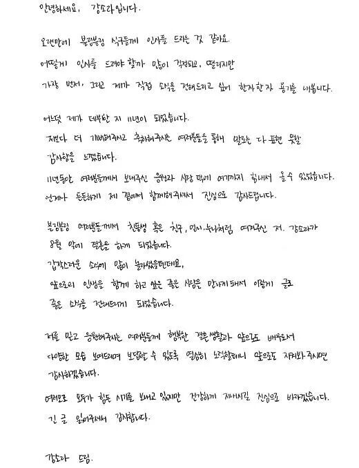 姜素拉于17日下午通过官方粉丝俱乐部上传亲笔信,向粉丝们传达了她即将结婚的消息和感想。