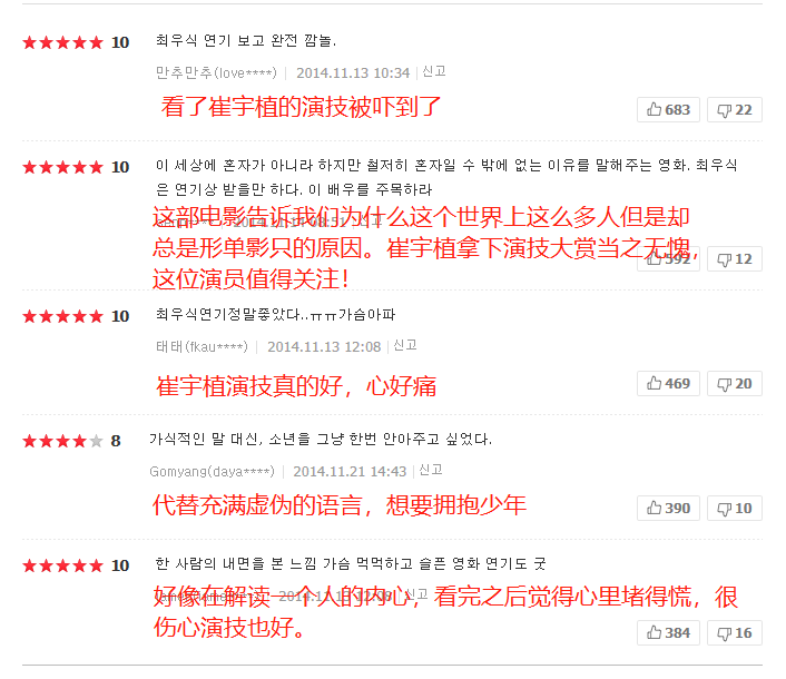 在电视剧领域多半以黄金配角出现的崔宇植,在电影领域可以说是如鱼得水大展身手,从金秀贤主演的《隐秘而伟大》开始,他生动的表演一下子就给观众留下了深刻的印象。2014年他作为电影主角站在了大众的面前。