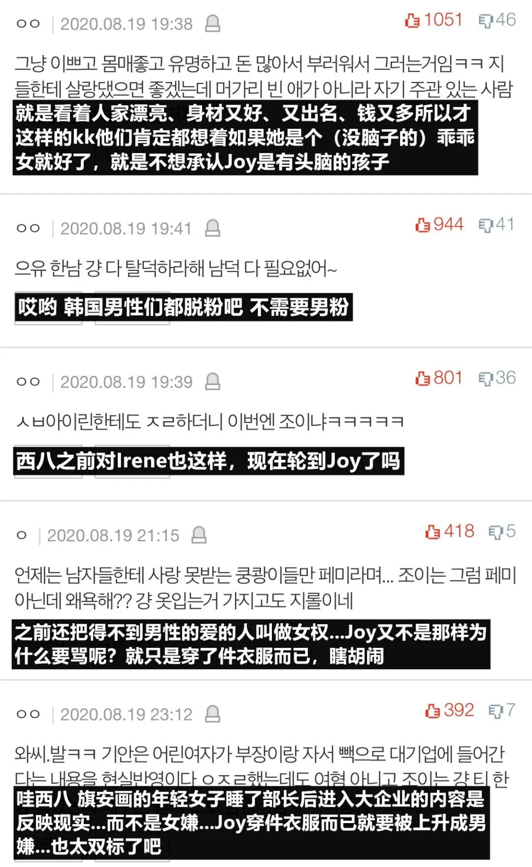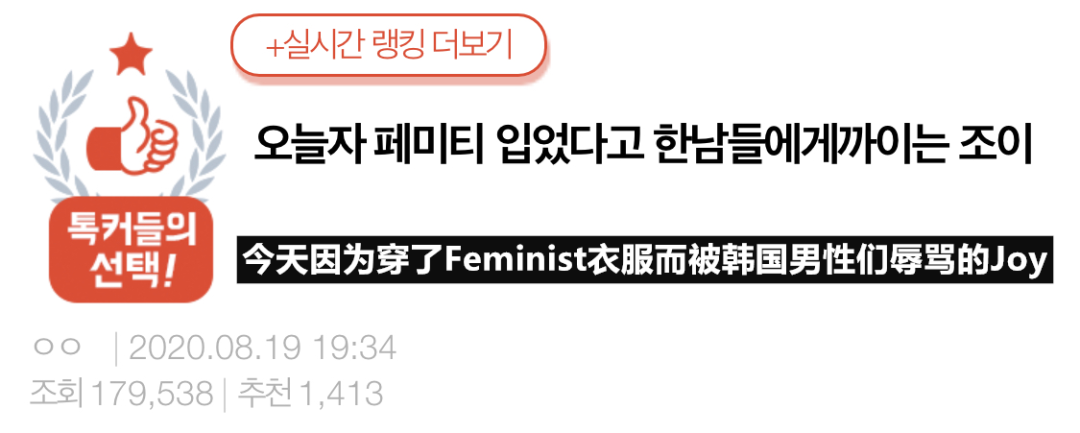 8月19日,某网友在韩网nate pann上传了一篇题为《今天因为穿了Feminist衣服而被韩国男性们辱骂的Joy》的帖子。