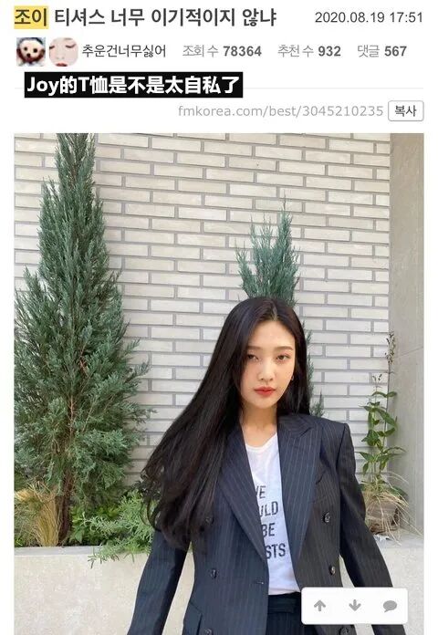 帖主表示:19日Joy在INS上传了文字和照片,但是图片中她外套里面搭的衣服是写着“我们都应该成为女权主义者”的T恤。韩国男性们在看到那个后正在发疯中。说什么女权Velvet之类的,正对着Joy大骂...但是那件衣服实际上是迪奥的,好像许多明星都会穿,总之韩国男性们真的很恶心。