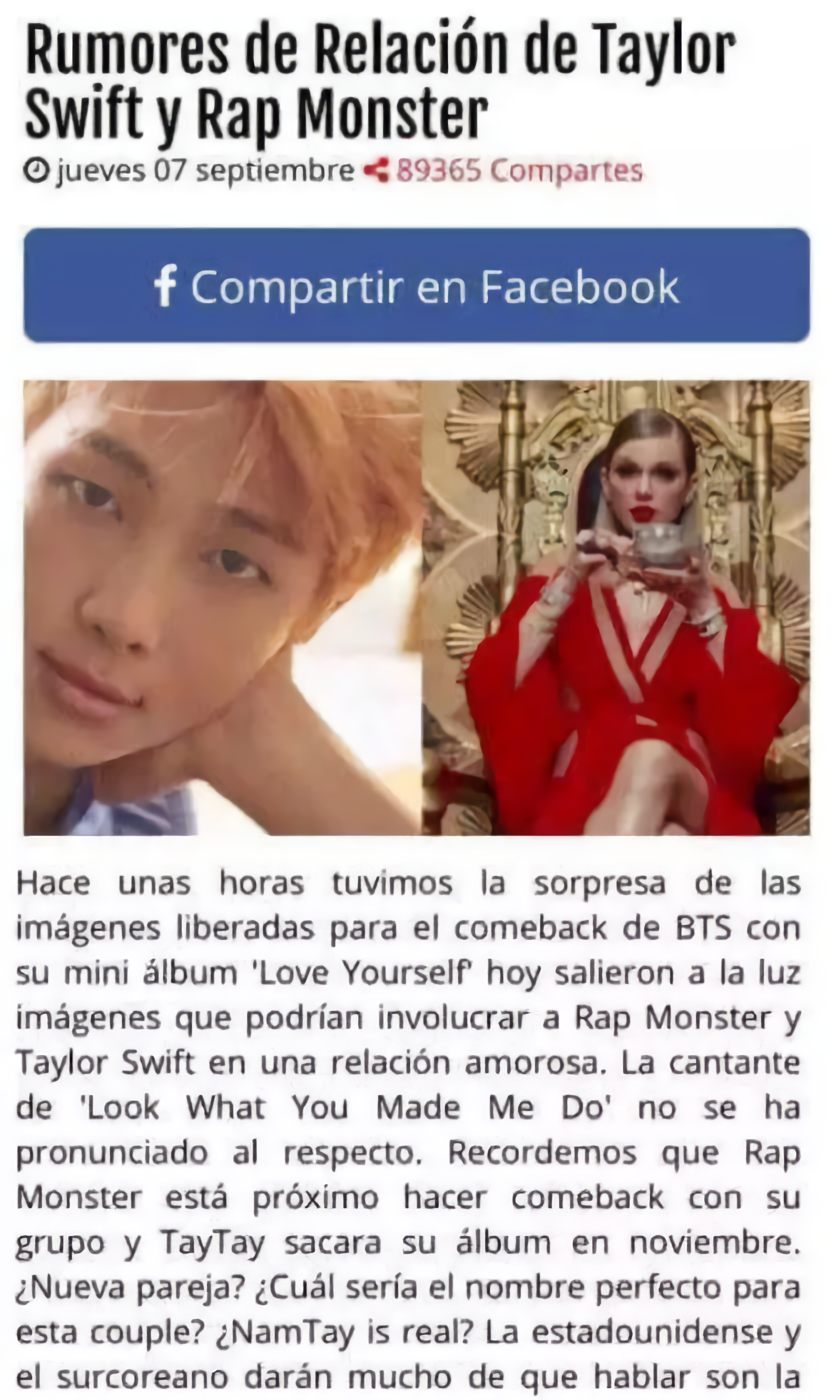 早前在西班牙媒体间引起争议的是防弹少年团金南俊和美国著名歌手泰勒·斯威夫特的恋爱新闻。当时西班牙媒体报道金南俊和泰勒·斯威夫特是恋人关系时给出的证据是“他们会相互交换歌曲的歌词”,新闻爆出后立刻受到了网友“无稽之谈”的抨击,两人的恋爱传闻也是不攻自破。