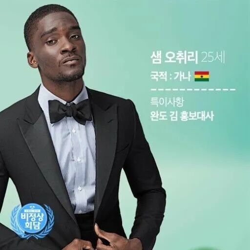 Samuel Okyere近几年一直活跃在韩国综艺界,他曾出演包括《非首脑会谈》《真正的男人》《大韩外国人》在内的多部综艺,因为说话风趣,备受观众们的喜爱。
