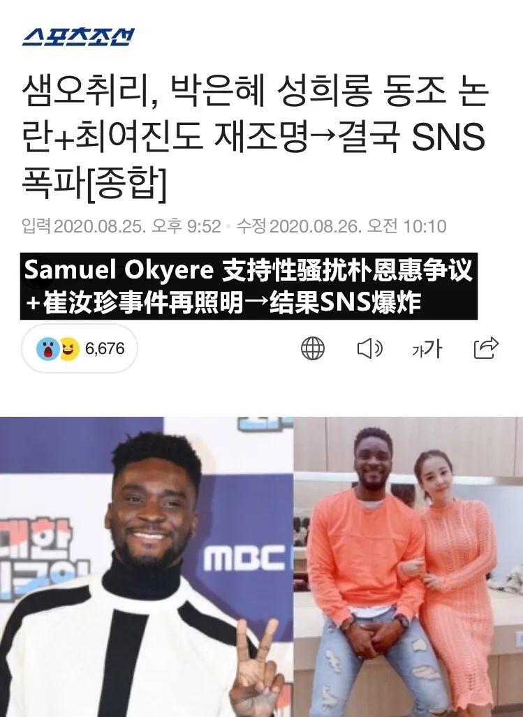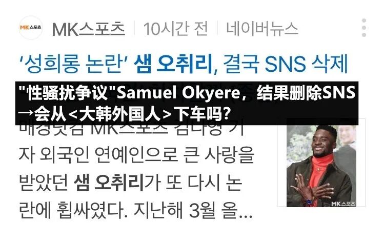 近日综艺人Samuel Okyere因为去年发表的INS内容被网友质疑性骚扰引发争议,相关新闻昨日立刻登上了韩网热搜。同时因为性骚扰争议的发酵,早前他关于种族歧视的新闻也再次被媒体进行了报道。下面来了解一下具体内容。
