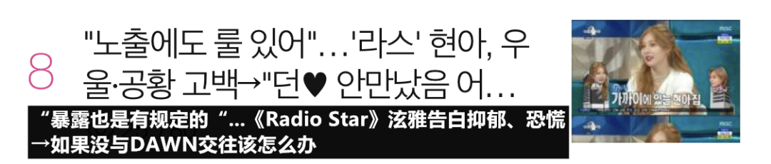 此前,张英南、申素率、泫雅、金曜汉一起出演了26日播出的MBC《Radio Star》“虽然反转但没关系”的特辑节目。其中泫雅在节目中谈及了自身的健康、生活状态、与男友DAWN的相处之道等话题,随后便登上了韩网热搜,受到了网友们的关注。