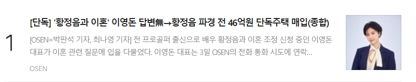 据悉,今年6月,黄正音以46亿5000万韩元的价格购买了位于首尔市龙山区梨泰院洞的3层高级单独住宅。对此,有网友谨慎地猜测黄正音是不是早已着手为离婚做准备。虽然目前黄正音对离婚一事没有表现出什么特别的立场,不过大家对于她的关心和支持却持续不断。