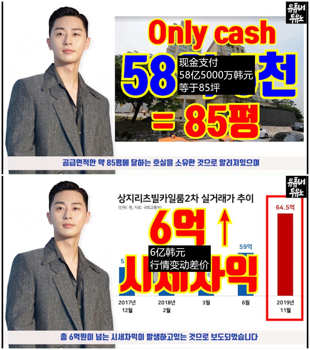 在此收益基础上,朴叙俊在2018年2月购入了位于首尔清潭洞的一处价值58亿5000万韩元的85坪住房,并且无贷款全现金支付。两年间该住房房价上升到了64亿5000万韩元,行情变动差价超过6亿韩元。