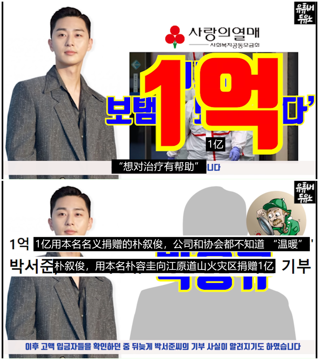 虽然赚得钱非常多,但帅哥做过的善行也一样不少。今年2月,朴叙俊为患者捐赠了1亿韩元用于购买新冠肺炎治疗需要的医疗器械,去年也为江原道山火受灾地区的灾民捐赠了1亿,特别是捐赠当时由于朴叙俊以自己本名朴容圭的名义捐赠,后期核对时才发现并被报道。帅哥默默无闻做善事,值得鼓掌!