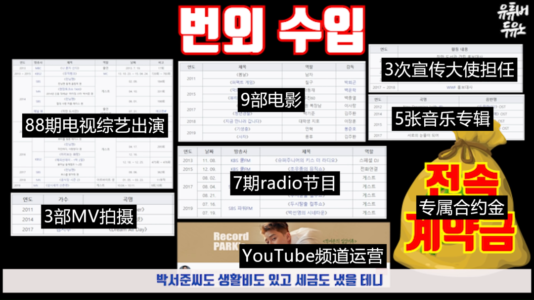 另外在电影领域,除去短篇和特别出演,他参与的电影有5部,再加上88期的电视综艺出演、7期radio节目、3部MV拍摄、5张音乐专辑、还有3次担当了仅一次就可收益数亿韩元的宣传大使、基本观看数多达数十万的YouTube频道运营,加上上亿甚至数十亿韩元的专属合约金,朴叙俊拥有数不清的额外收入。