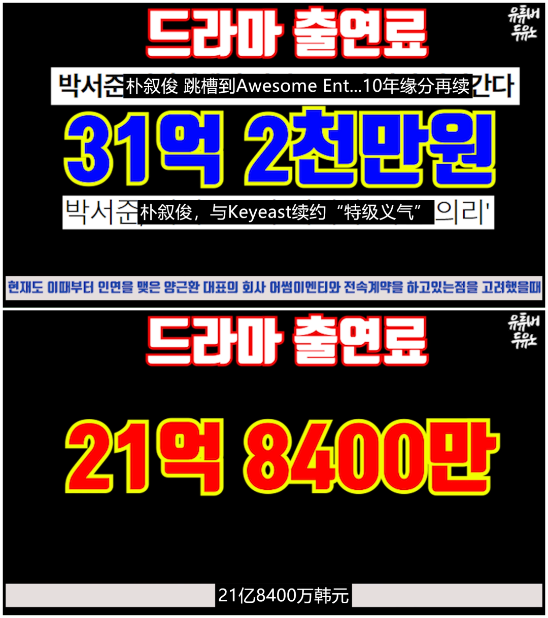 2015年合约到期的同时他又与老东家Keyeast再次续约,那么按照7:3的收益分配,朴叙俊总共得到21亿8400万韩元的收入。