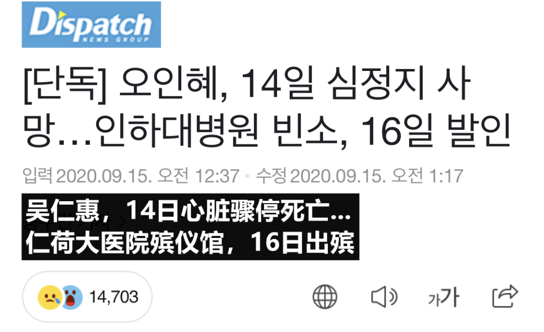 据吴仁惠的朋友14日对D社表示:“发现她的时候已经是危急状态,虽然没有放弃希望,但最终还是救治无效”,并透露了吴仁惠死亡的消息。据悉吴仁惠的葬礼灵堂设在仁荷大医院殡仪馆,于16日出殡。