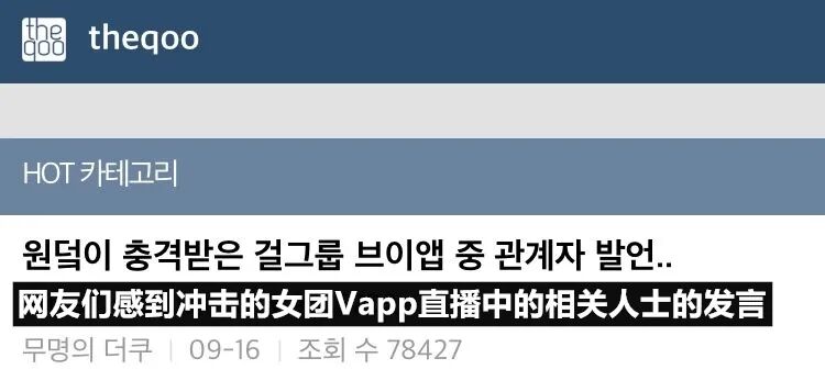 16日晚,韩网the qoo有网友发帖表示组合FANATICS成员10天前的V LIVE直播中,好意递衣服给直播成员遮腿的另一成员受到了一旁工作人员的辱骂。