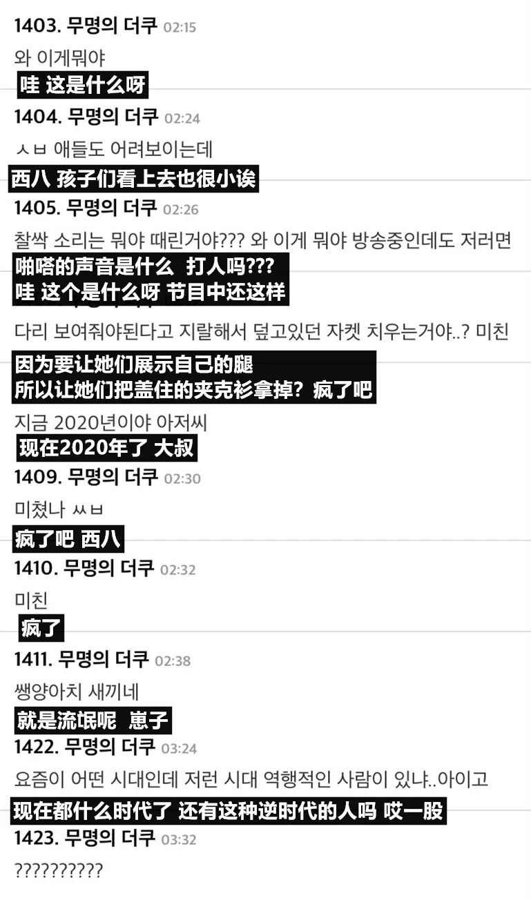 直播当时,因为成员们穿的下装非常短,所以在一旁未出镜的中国成员廉斯嘉就拿了衣服给成员们盖腿。在她第二次给成员们盖腿时,却遭到了一旁男性工作人员的辱骂。该工作人员表示:挡住怎么办?本来就是想给大家看的,你难道是傻瓜吗?成员们在看完工作人员的脸色后,尴尬地拿走了盖在腿上的衣服。