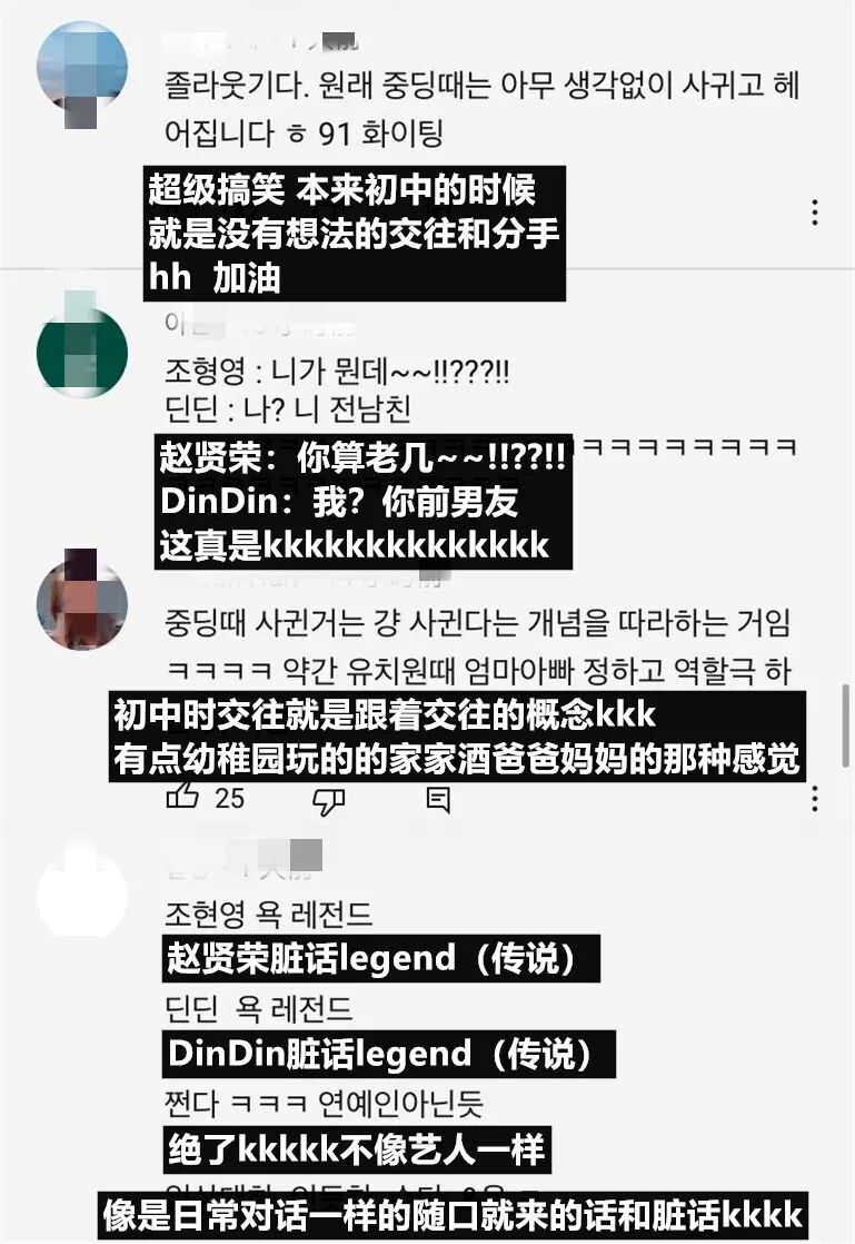 据DinDin表示,初中时他们俩成为了同桌,他就自然而然地向赵贤荣提了交往。之后他们还曾单独去屋顶互相辅导做作业,结果两人都不会做,谁也教不了谁。而交往后,他就发现两人性格不合,恰逢后辈女生向自己表白,DinDin就提出了分手。而赵贤荣为了不示弱就和DinDin的好友法久进行了交往。这段幼稚的恋爱史真是太搞笑了,还真是“初中生行为”呢!