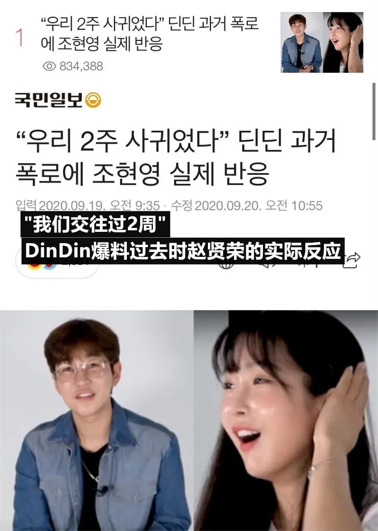 近日歌手DinDin在参加好友Rainbow成员赵贤荣的油管采访时,提及了他曾和赵贤荣交往过的事实,相关新闻立刻登上韩网热搜头条,引起了众网友的关注。