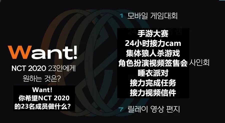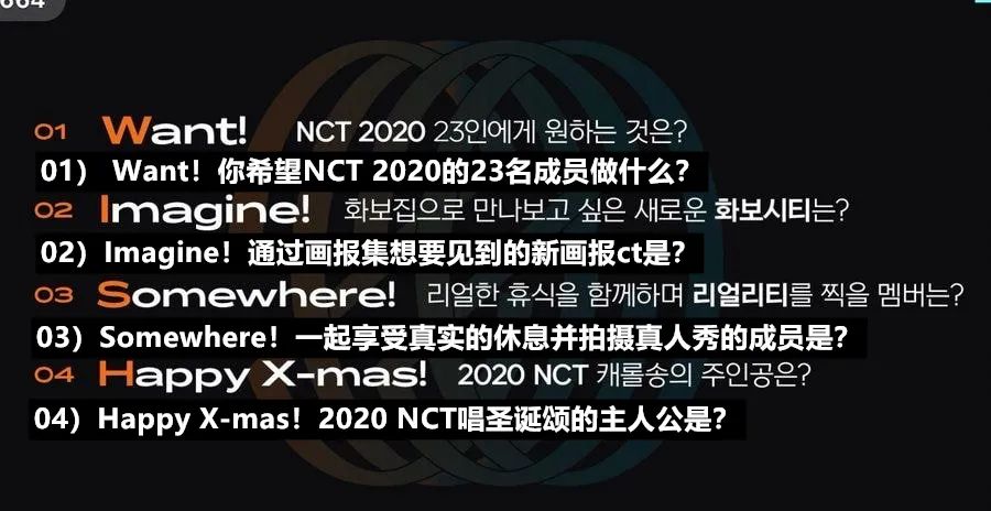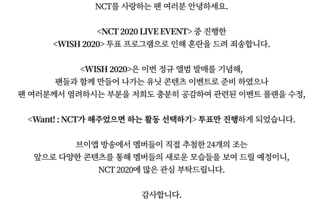 喜爱NCT的粉丝们,大家好。因为在《NCT 2020 LIVE EVENT》中进行的《WISH 2020》投票而产生混乱,在此向大家致歉。《WISH 2020》是为了纪念这次正规专辑的发表,和粉丝们一起制作的小组活动。粉丝们所担心的问题,我们也有同感,因此会修正有关活动。只会进行《Want!:选择希望NCT参与的活动》的投票。在直播中成员们亲自推荐的24个组合以后会通过多样的活动展示多样的面貌,请大家多多期待NCT 2020。谢谢。最终网友们得知取消了画报组、真人秀组、圣诞颂组的投票,只会进行《Want!:选择希望NCT参与的活动》的投票后,都表示:“幸亏取消了”...