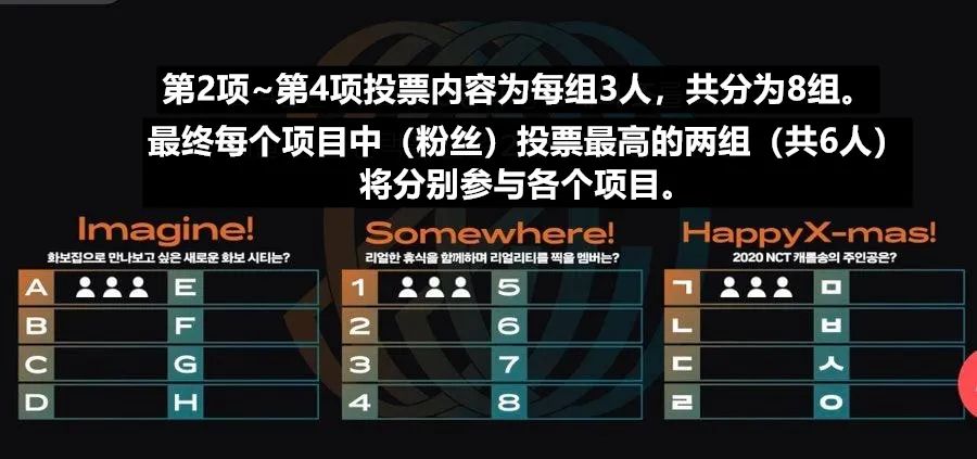 而第二项~第四项投票内容规定(画报组、真人秀组、圣诞颂组)为每组3人,共分为8组。最终每个项目中(粉丝)投票最高的两组(共6人)将分别拍摄画报、参加真人秀、演唱圣诞颂。