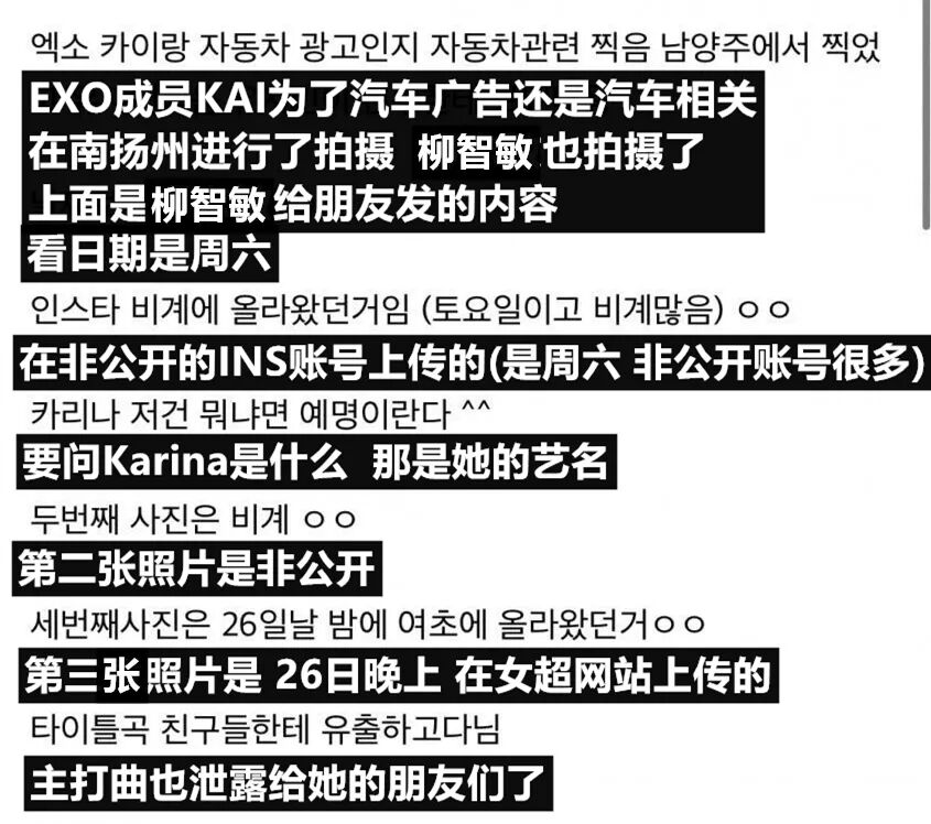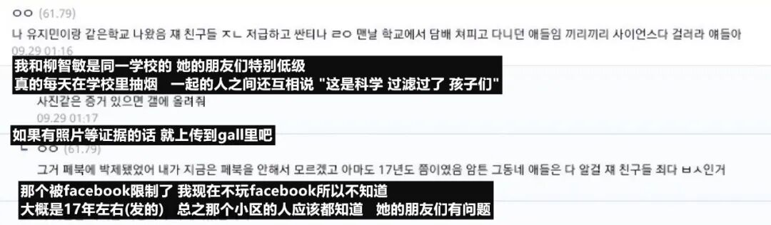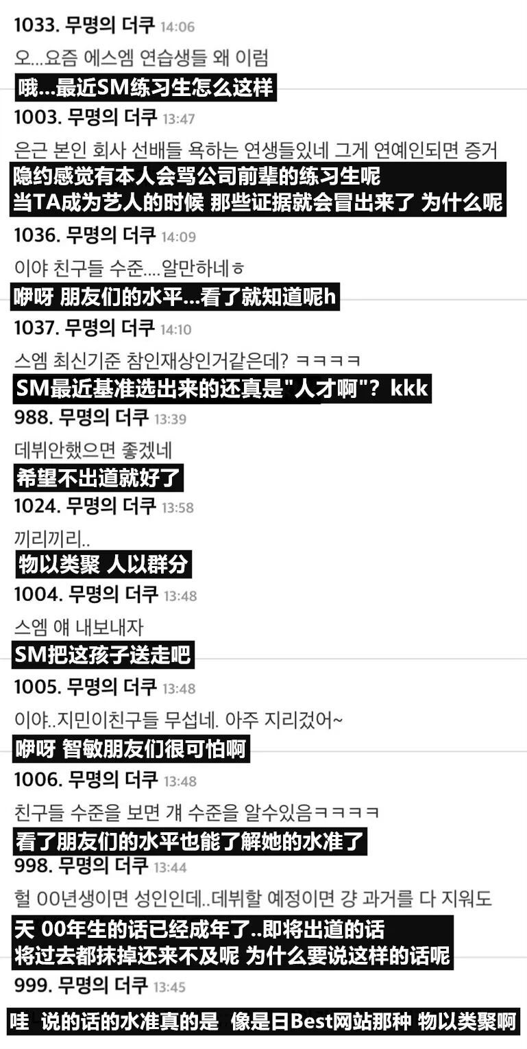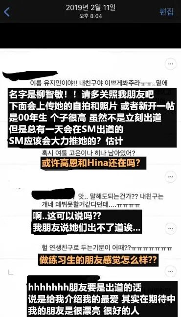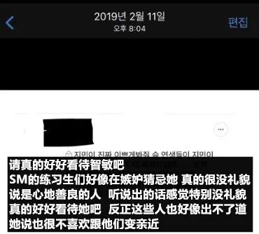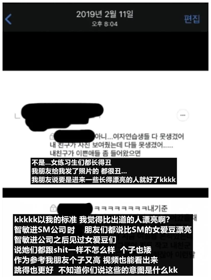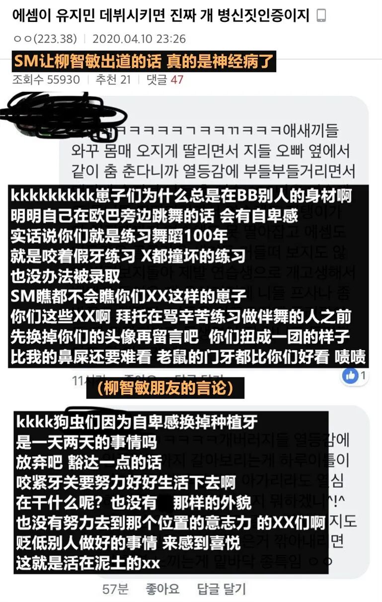 帖主对此表示十分生气,同时她还表示练习生柳智敏的朋友人品也十分堪忧,并po出了柳智敏好友早前的各种言论,言论中提及柳智敏进入SM见到艺人们之后曾吐槽艺人们长得不好看等。