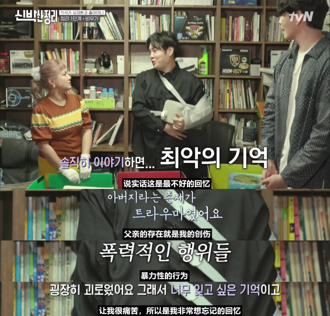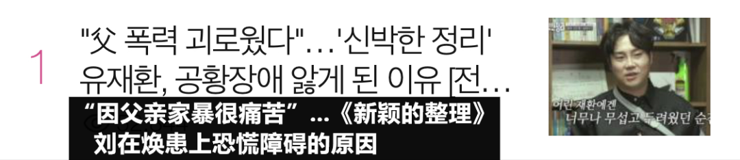 之后主持人朴娜莱提到从来没有听说过关于刘在焕父亲的话题,刘在焕便坦言:“说实话这是最不好的回忆,父亲的存在就是我的创伤。那些暴力性的行为让我很痛苦,所以是我非常想忘记的回忆”。