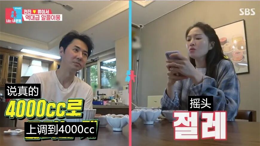 左右滑动可查看更多于5日播出的《同床异梦2》中,“演艺界代表酒徒”JUNJIN说到“天气这么阴沉,不如来一杯烧酒作佐餐呢”,提议两人一起共饮。但事实上妻子刘伊瑞并不是擅长喝酒的人,反驳道“都约好了不喝的”。对于妻子的酒量表示遗憾的同时,还试图把自己原本一周3000cc的酒量提升到4000cc,但是气氛突然变冷的刘伊瑞摇着头“现在已经喝得够多了”拉开了两人之间微妙的神经战。作为完全相反的“酒徒丈夫VS无酒精妻子”,刘伊瑞说着“如果为了让互相都没有压力的话是不是应该分手”,吐露了曾经因此经历的婚前分手危机。