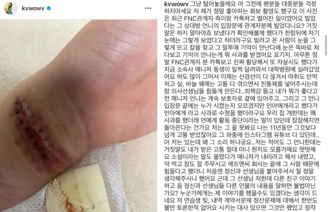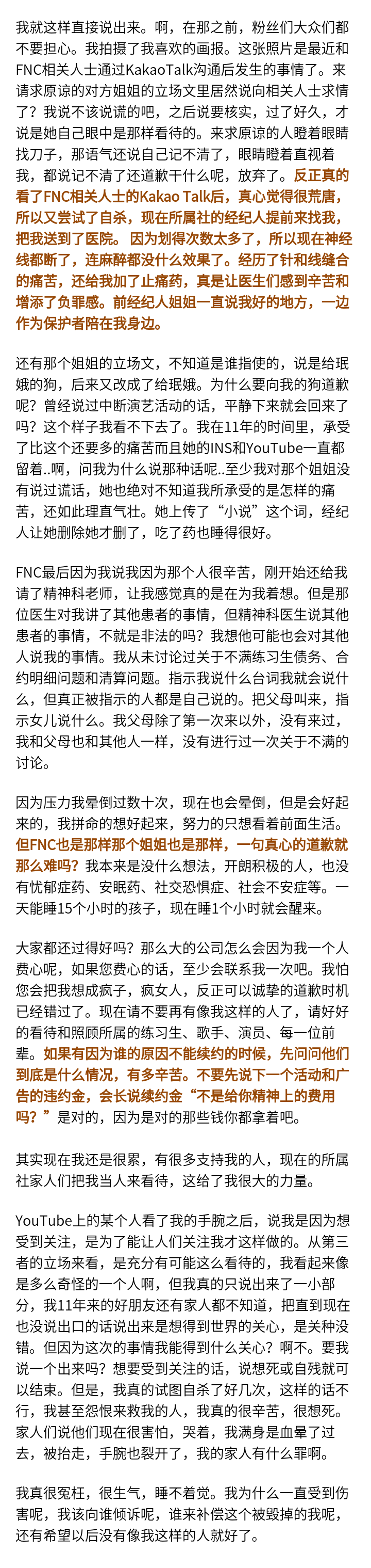 (点击阅读原文)时隔一个月,8月6日,权珉娥接连更新3条INS道出自己近段时间曾自杀过,目前正在接受治疗的事实,同时她还在文中质疑FNC把事情处理得没有诚意。相关内容被记者报道后,立刻引起了关注。