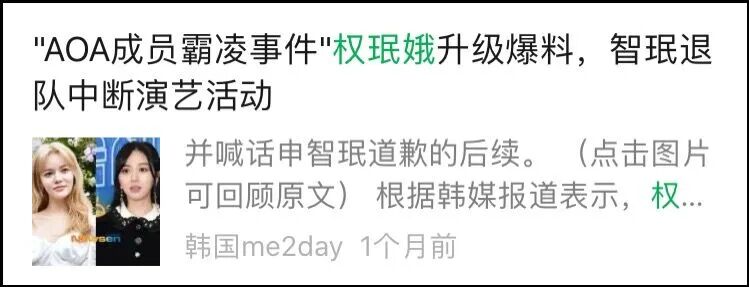 此前7月3日,艺人权珉娥通过INS公开了自己受到霸凌并患抑郁症的消息,当时她在INS中实名表示自己曾受到AOA成员申智珉长达10年的欺凌,并喊话申智珉道歉。此后申智珉就相关事件道歉,4日时AOA所属社FNC发文表示申智珉正式退出AOA,并中断所有的演艺活动,当时的事件引起了非常大的争议。
