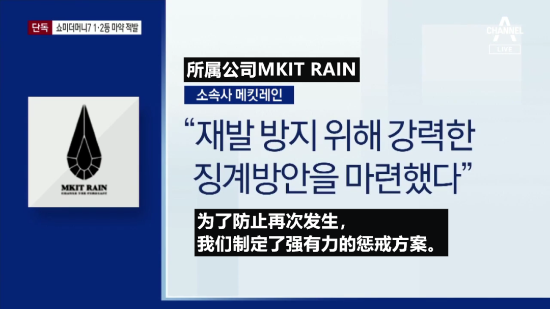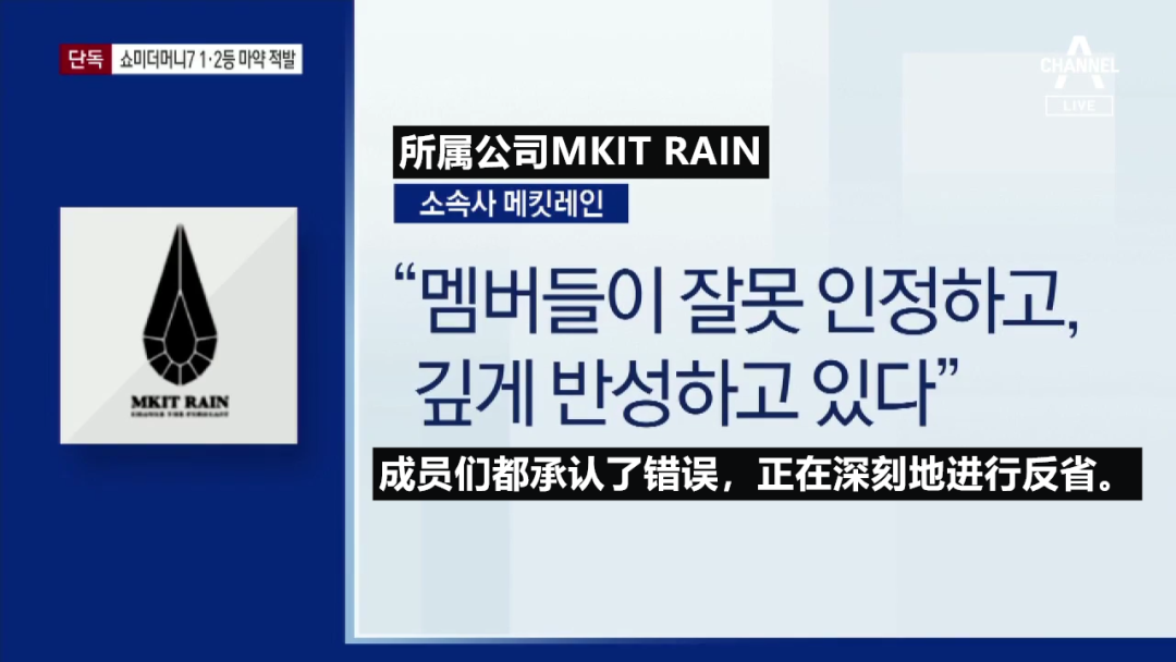 目前该所属公司MKIT RAIN方面已承认旗下五名rapper( Nafla、Loopy、Owen、Bloo、Young West)全员吸毒的嫌疑,并表示:“成员们都承认了错误,正在深刻反省。为防止再次发生,我们制定了强有力的惩戒方案”。