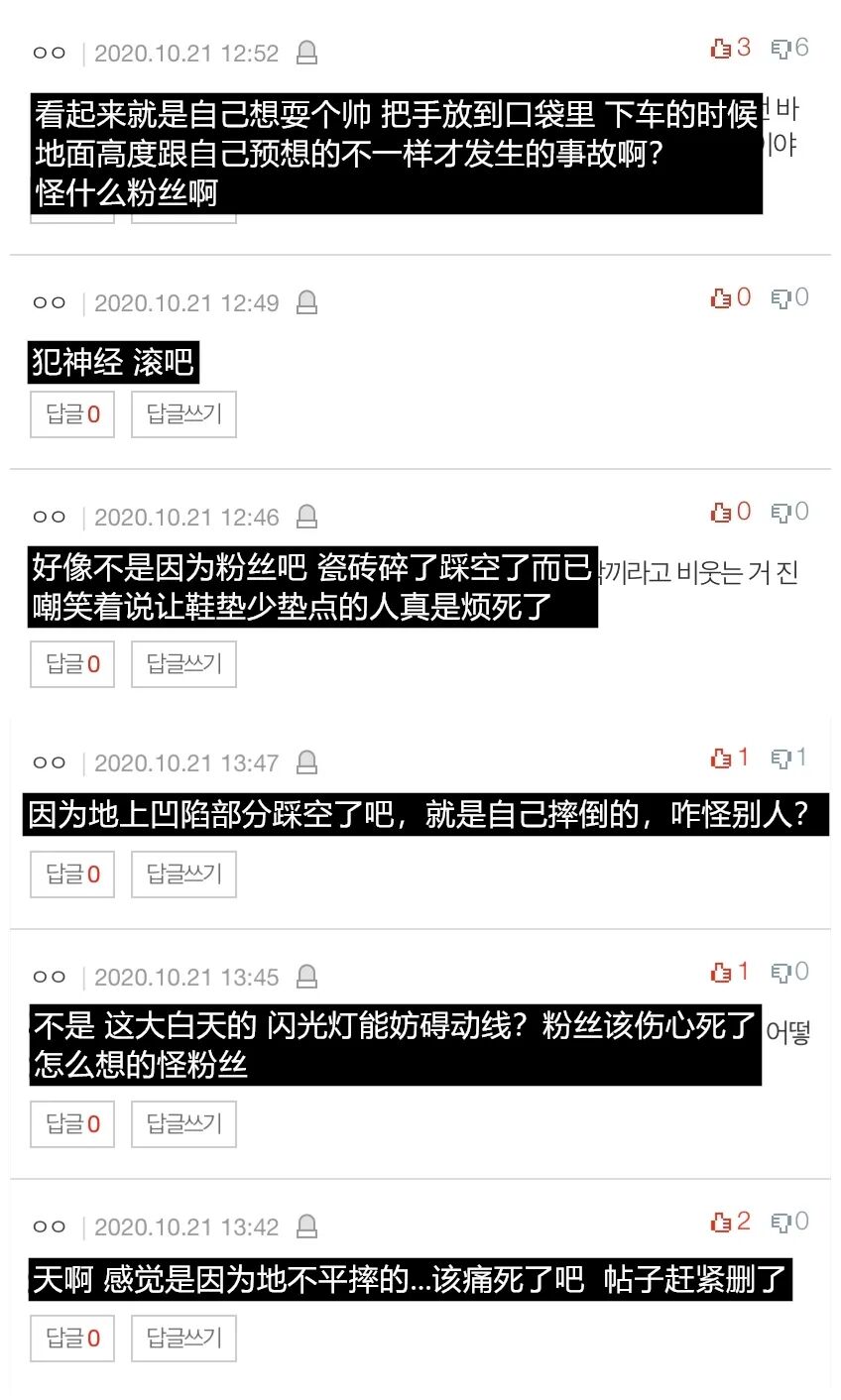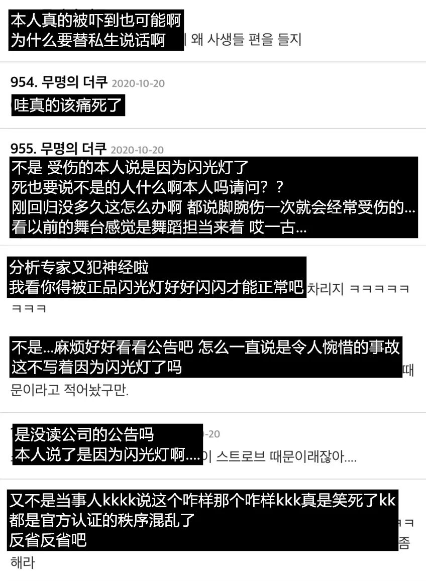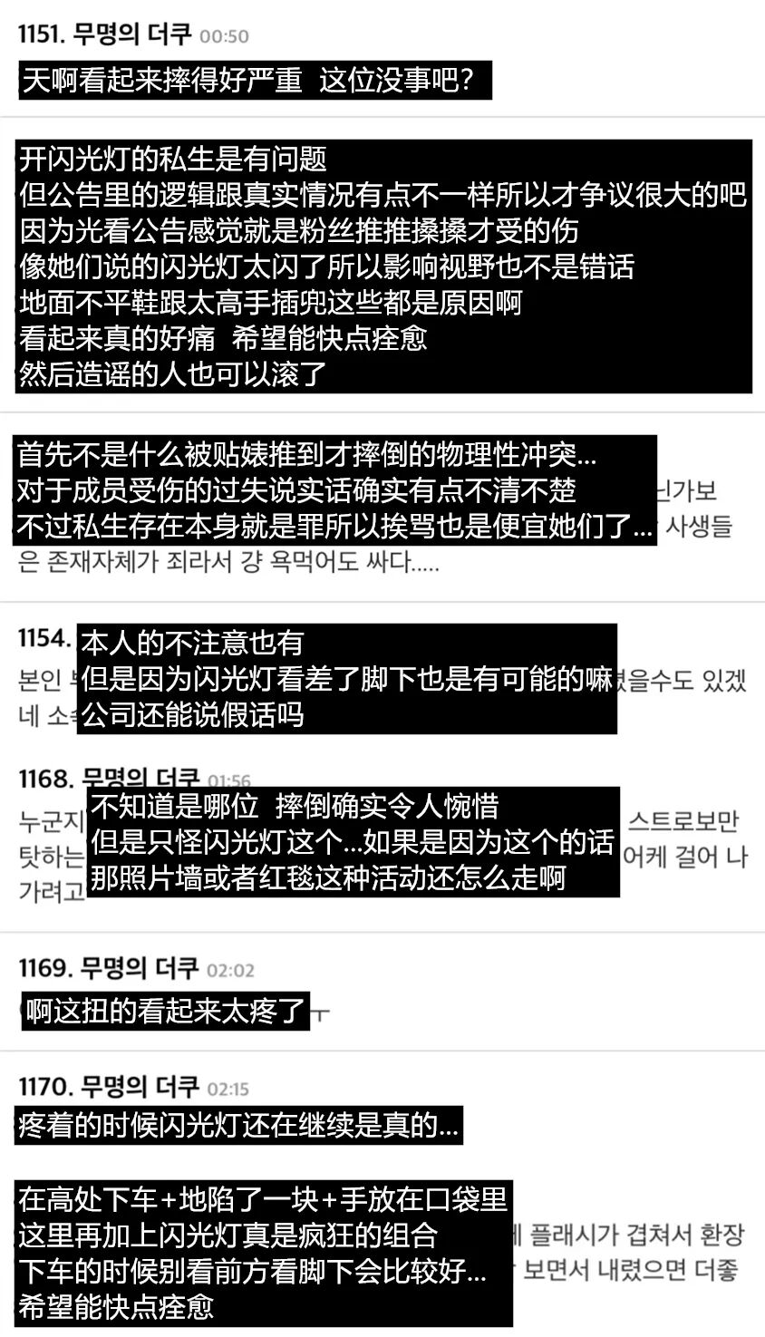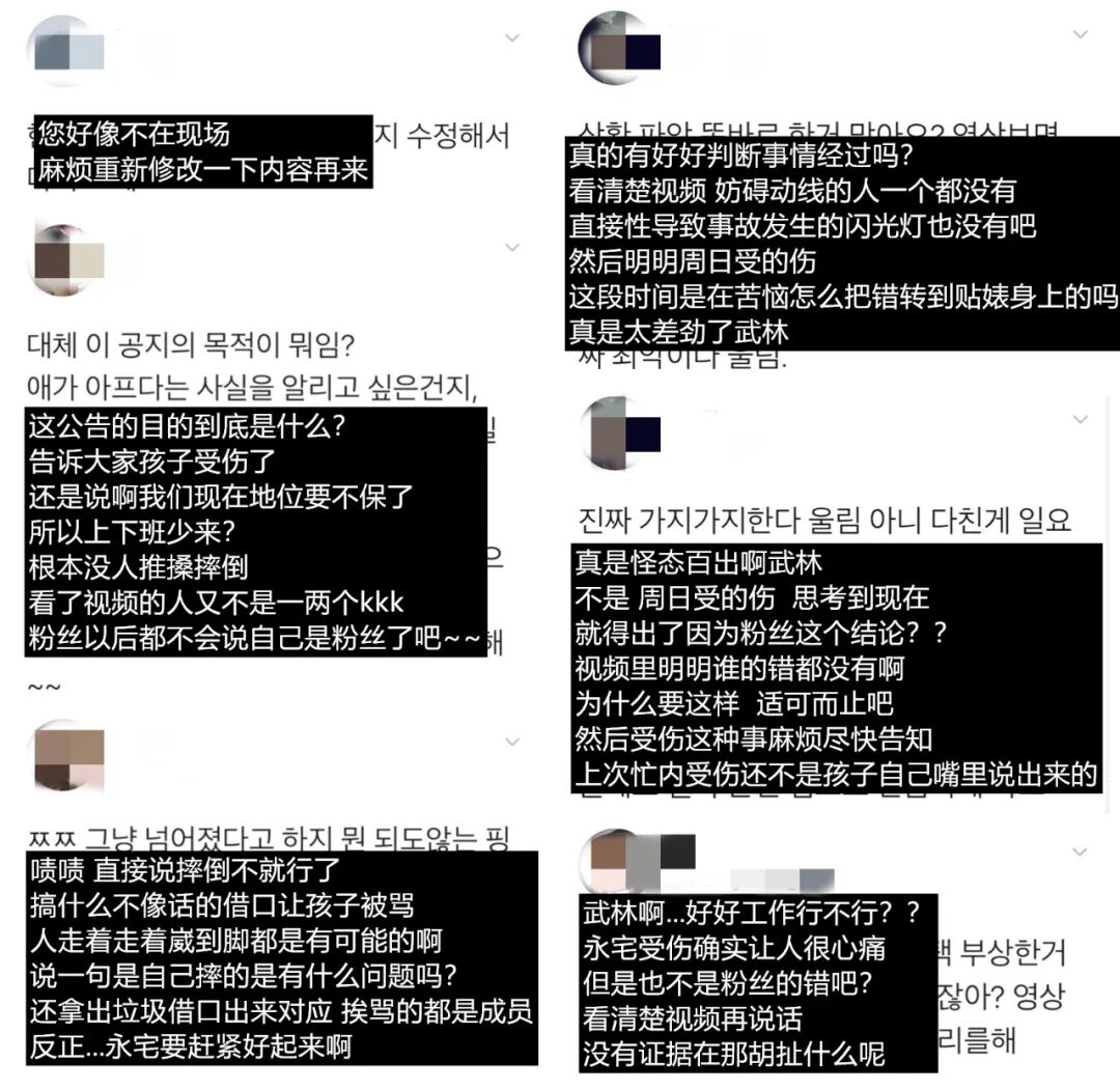 而作为这件事情的另一方主人公,大部分粉丝表示自己感到真正愤怒的地方,是公司看起来毫无诚意和事实根据的这篇公告。发布时间上就拖延了整整两日不说,与Woollim主张的“由于对成员们直接性的打闪光灯和动线妨碍而导致TAG摔倒”,后续传言中还有“摔倒以后粉丝们一拥而上”“现场十分混乱”等不实内容相反,真相是事情发生的整个过程中,没有任何一个粉丝近身成员,做出所谓的“妨碍行为”。单纯因为“闪光灯”这一原因就把所有矛头指向粉丝,并且把当事成员推上风口浪尖遭受无谓的谩骂这几点,实在是无法忍受。