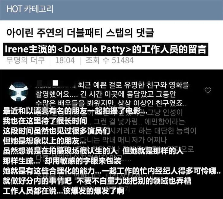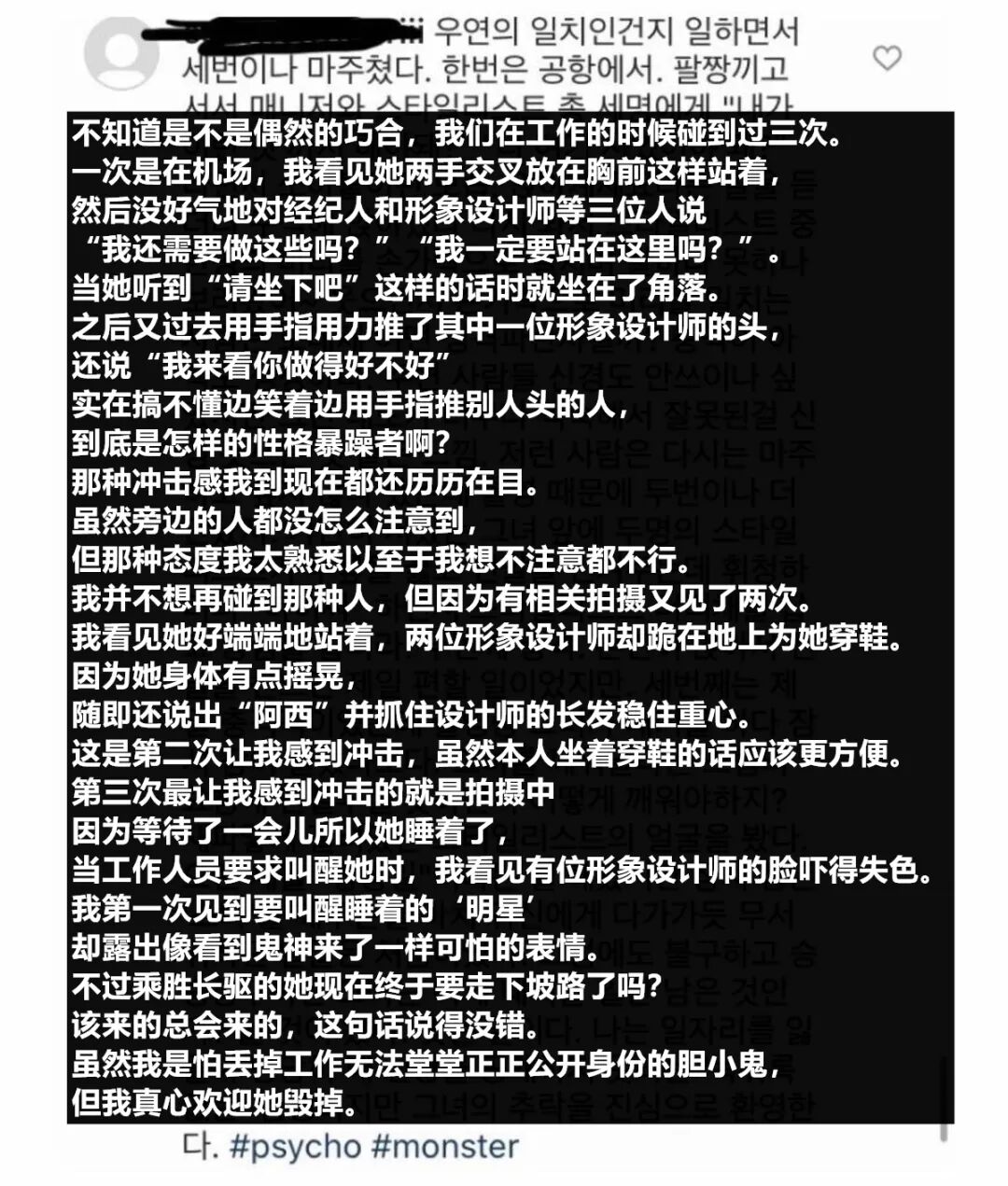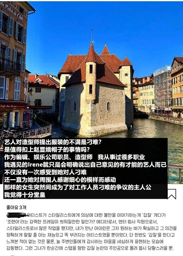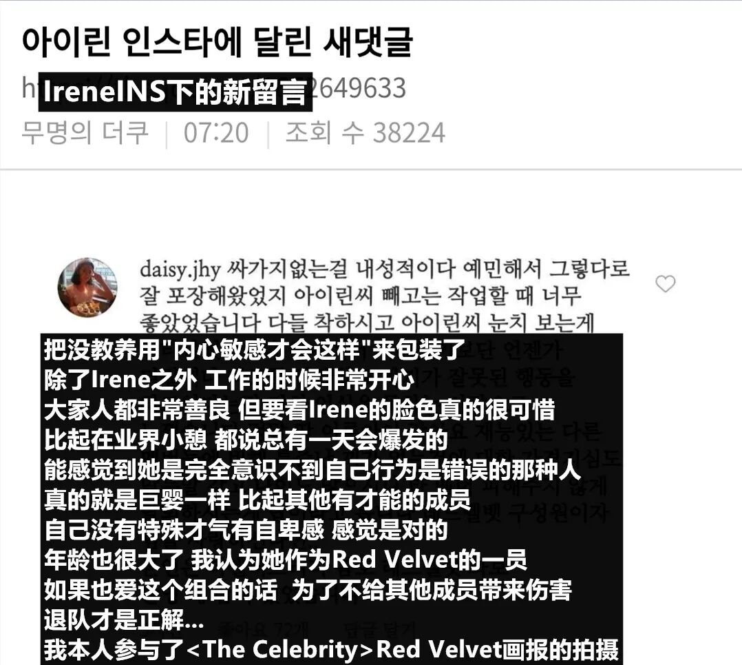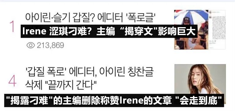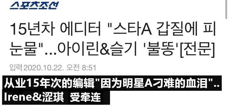 22日上午“从业15年的时尚编辑、造型师控诉某女艺人职场刁难”的新闻占据了韩网热搜。根据韩媒的报道,编辑A某发表INS控诉女艺人B某职场刁难,种种迹象显示该女艺人为Red Velvet Irene。A某发表INS后,时尚界以及演艺界相关人士纷纷支持为其点赞甚至发文吐槽,其中包括Red Velvet的伴舞、SM艺人的造型师、与Irene一起拍摄电影的工作人员等。相关争议曝光后瞬间占据了韩网门户网站及讨论社区的热门。