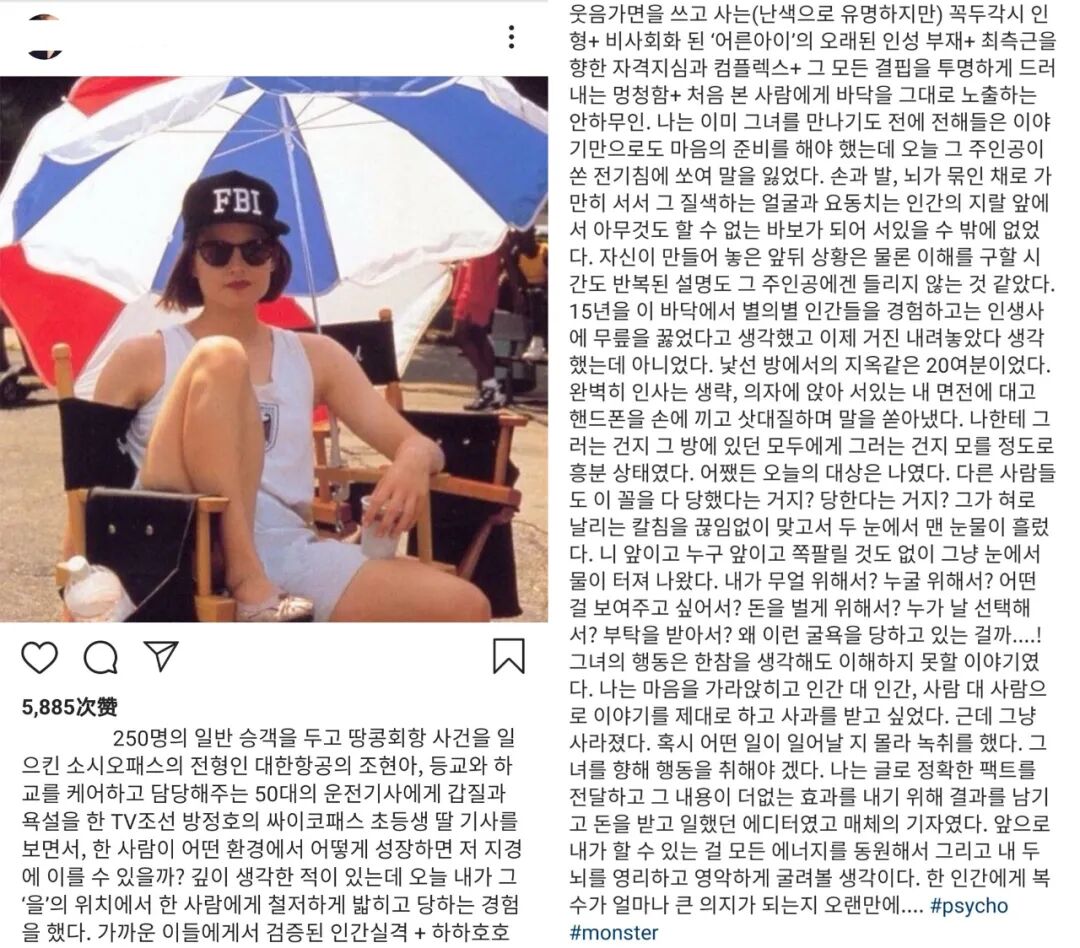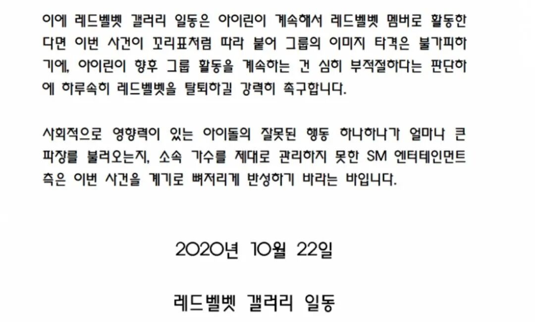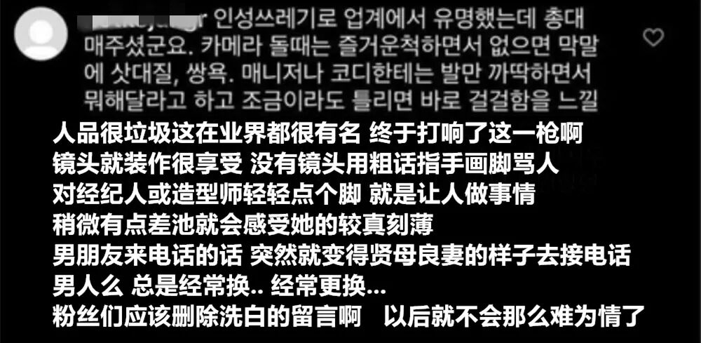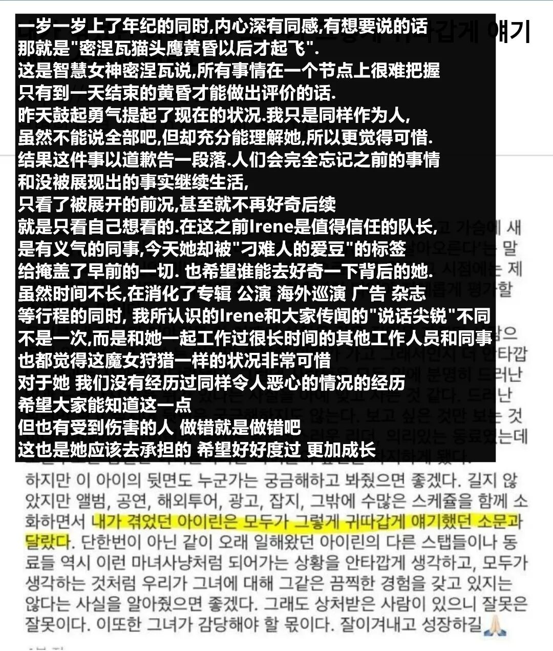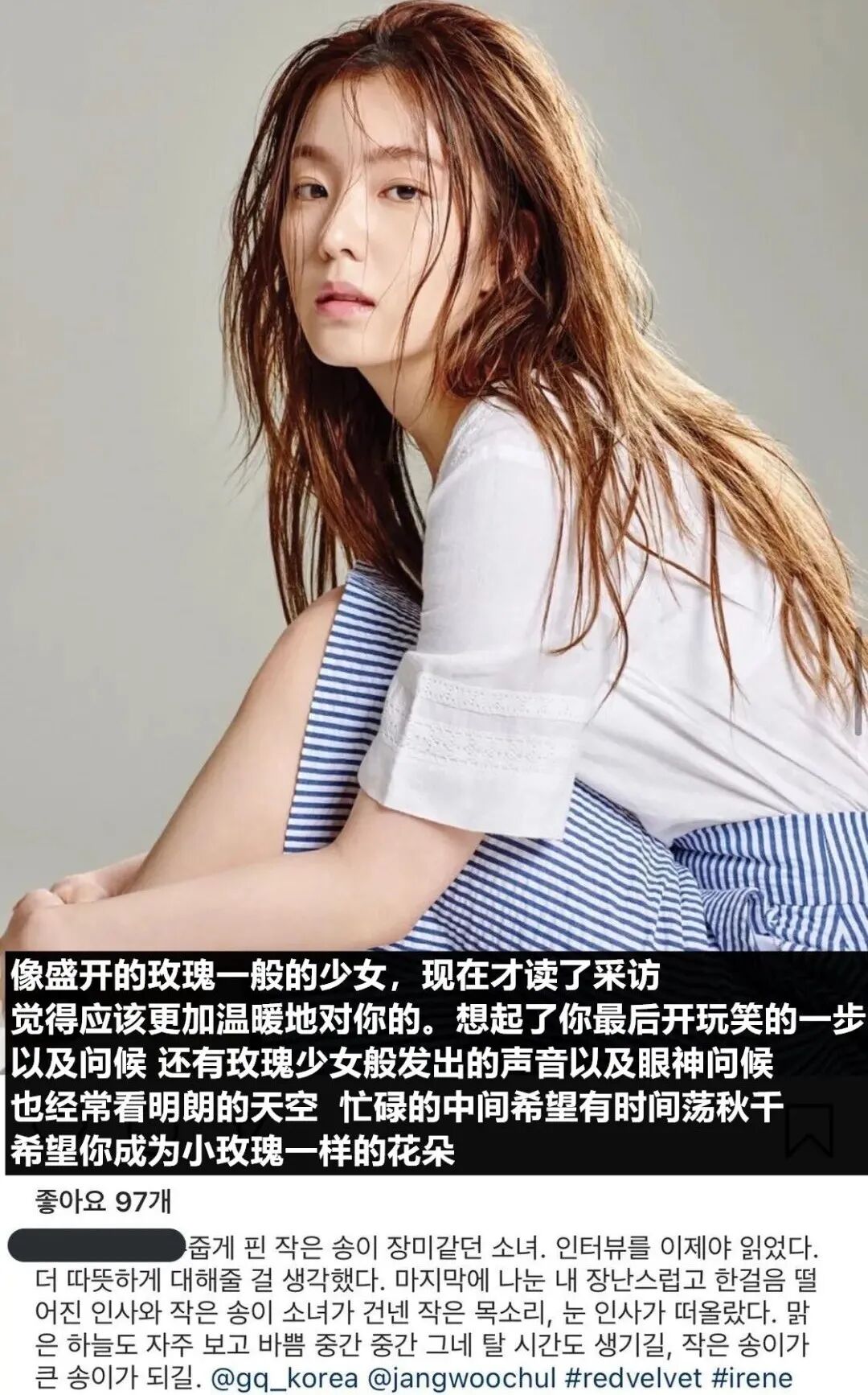 22日上午“从业15年的时尚编辑、造型师控诉某女艺人职场刁难”的新闻占据了韩网热搜。根据韩媒的报道,编辑A某发表INS控诉女艺人B某职场刁难,种种迹象显示该女艺人为Red Velvet Irene。A某发表INS后,时尚界以及演艺界相关人士纷纷支持为其点赞甚至发文吐槽,其中包括Red Velvet的伴舞、SM艺人的造型师、与Irene一起拍摄电影的工作人员等。相关争议曝光后瞬间占据了韩网门户网站及讨论社区的热门。