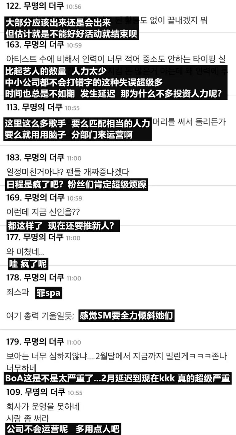 粉丝们表示目前SM旗下艺人都将在2020年剩余8周内紧锣密鼓地开展活动,新女团在这样的时间点出道很可能会影响到原先艺人的回归,导致回归延迟等。根据粉丝们的统计:①BoA出道20周年,将于今年年内回归(2月发了预告,之后回归延迟,目前已经和金世俊进行了封面拍摄)。②Super Junior出道15周年,将于12月回归(11月6日拍摄了MV)。③泰民正规Act act2回归(MV已经拍完,也录了回归综艺)。④NCT2020 part2回归(与11月Part1里出现的成员会不同)。⑤允浩solo回归(日本8月就开始专辑预售,MV已经拍摄完成)。⑥KAI solo出道(预计下半年出道,具体日程未定)。⑦Red Velvet完整体回归。在这样的情况下推出新女团,SM公司的人力将非常紧张,对此网友们纷纷表示“SM怎么这样”“希望不要延迟艺人们的回归”等。