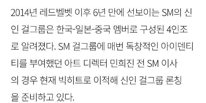 另外,早前韩媒曾报道表示SM女团将以4人组形式出道,成员们来自韩国、中国、日本等,究竟此次aespa的成员构成如何目前还未可知。